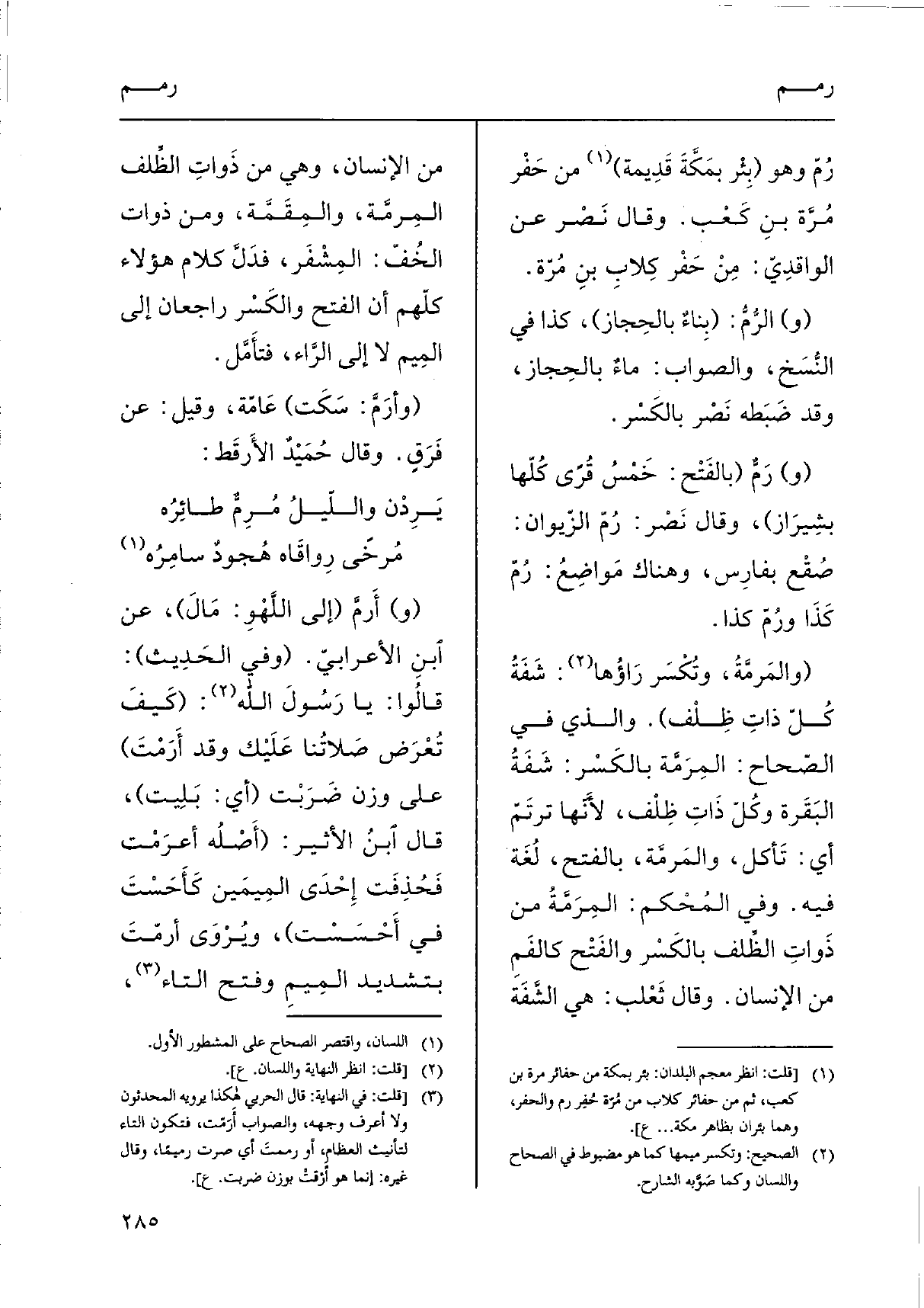 ( {والمَرمَّةُ، وتُكْسَر رَاؤُها: شَفَةُ كُلّ ذاتِ ظِلْف) . وَالَّذِي فِي الصّحاح: المِرَمَّة بالكَسْر: شَفَةُ البَقَرة وكُلّ ذَاتِ ظِلْف، لأَنَّها} ترتَمّ أَي: تَأكل، والمَرمَّة، بِالْفَتْح، لُغَة فِيهِ. وَفِي المُحْكم: {المِرَمَّةُ من ذَواتِ الظِّلف بالكَسْر والفَتْح كالفَم من الْإِنْسَان. وَقَالَ ثَعْلب: هِيَ الشَّفَة من الْإِنْسَان، وَهِي من ذَواتِ الظِّلف المِرمَّة، والمِقَمَّة، وَمن ذَوَات الخُفّ: المِشْفَر، فدَلَّ كَلَام هَؤُلَاءِ كلّهم أَن الْفَتْح والكَسْر راجعان إِلَى المِيم لَا إِلَى الرَّاء، فتأمَّل.