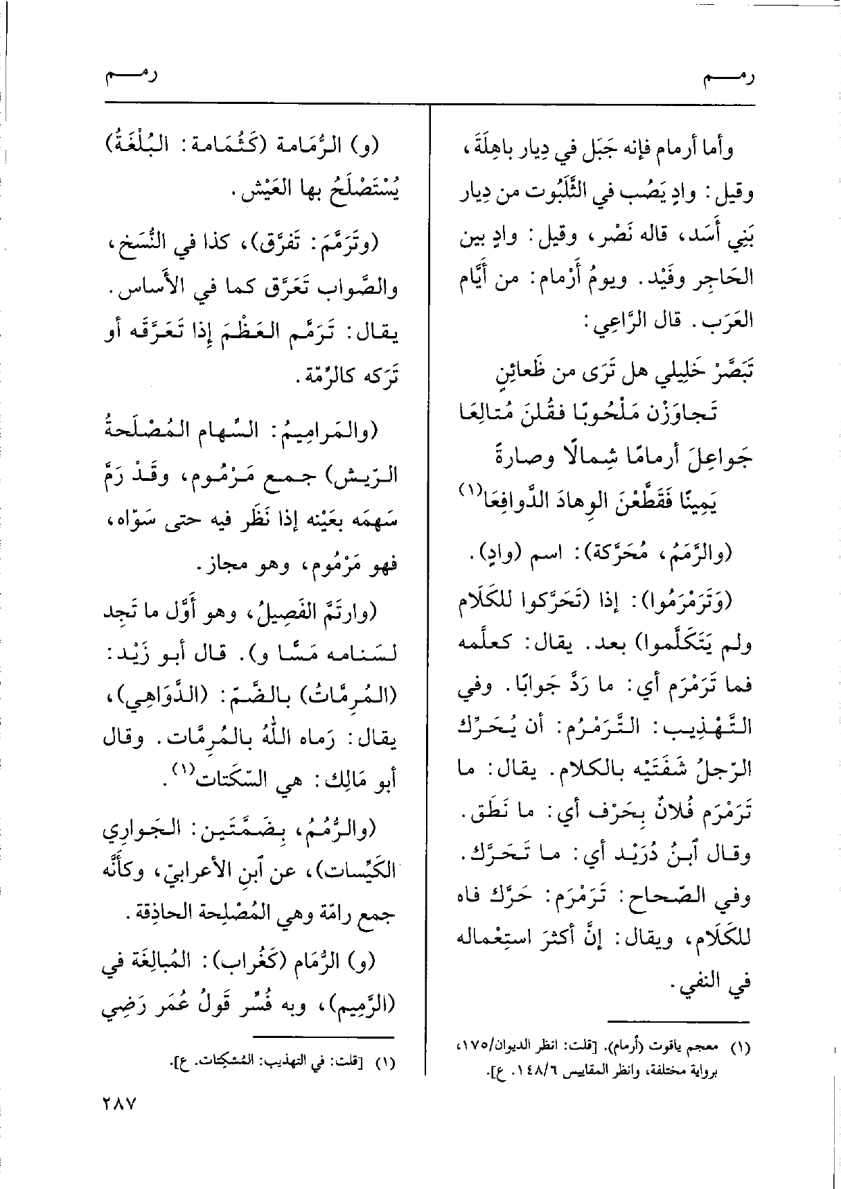(و) } الرُّمَام (كَغُراب) : المُبالِغَة فِي (! الرَّمِيم) ، وَبِه فُسِّر قَولُ عُمَر رَضِي