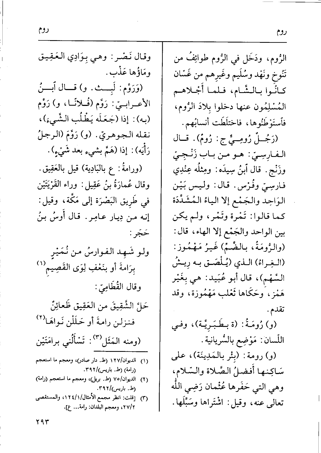(رَجُلٌ {رُومِيٌّ ج:} رُومٌ) . قَالَ الفارِسِيّ: هُوَ من بَاب زَنْجِيّ وزَنْج. قَالَ ابنُ سِيدَه: ومثلُه عِنْدِي فارسِيّ وفُرْس. قَالَ: وَلَيْسَ بَيْن الوَاحِد والجَمْع إِلَّا الياءُ المُشَدَّدَة كَمَا قَالُوا: تَمْرة وتَمْر، وَلم يكن بَين الْوَاحِد والجَمْع إِلَّا الْهَاء، قَالَ: ( {والرُّومَةُ، بالضَّمِّ) غَيرُ مَهْمُوز: (الغِراءُ) الَّذِي (يُلْصَق بِهِ رِيشُ السَّهْمِ) ، قَالَ أَبُو عُبَيد: هِيَ بِغَيْر هَمْز، وحَكَاها ثَعْلب مَهْمُوزة، وَقد تقدم.