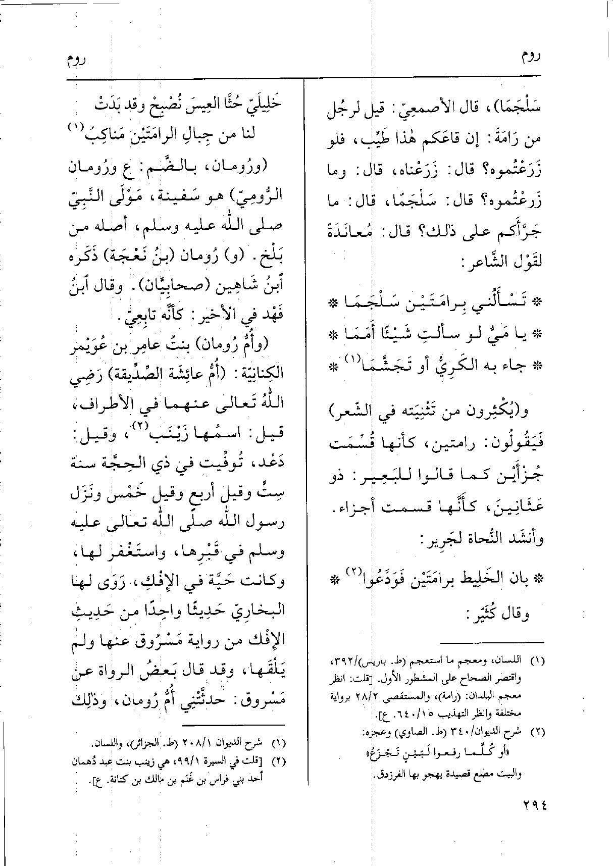 (وأُمُّ رُومان) بنتُ عامِر بن عُوَيْمر الكِنانِيّة: (أُمُّ عائِشَة الصِّدِّيقة) رَضِي اللهُ تَعالى عَنْهُمَا فِي الْأَطْرَاف، قيل: اسمُها زَيْنَب، وَقيل: دَعْد، تُوفِّيت فِي ذِي الحِجَّة سنة سِتٍّ وَقيل أربعٍ وَقيل خَمْس ونَزَل رَسُول الله [