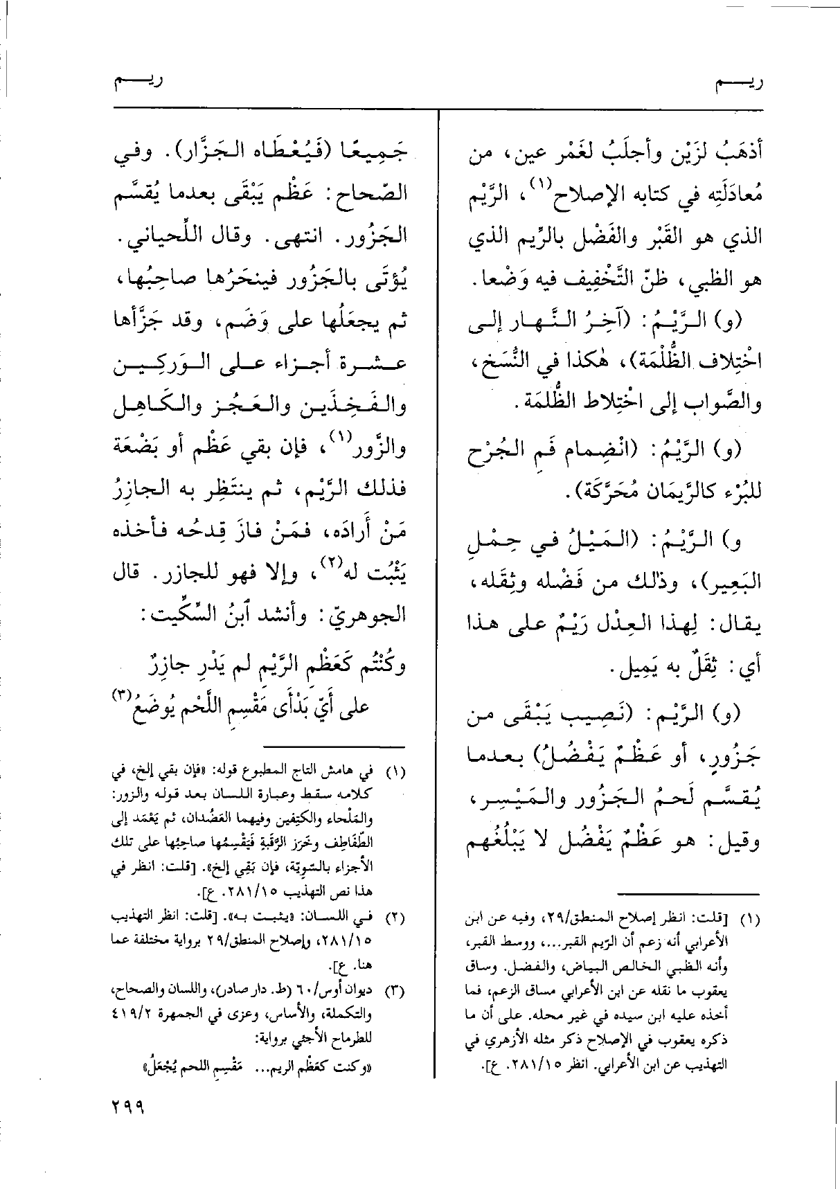 (و) } الرَّيْم: (نَصِيب يَبْقَى من جَزُورٍ، أَو عَظْمٌ يَفْضُلُ) بَعْدَمَا يُقسَّم لَحمُ الجَزُور والمَيْسِر، وَقيل: هُوَ عَظْمٌ يَفْضُل لَا يَبْلُغُهم جَمِيعاً (فَيُعْطَاه الجَزَّار) . وَفِي الصّحاح: عَظْم يَبْقَى بَعْدَمَا يُقسَّم الجَزُور. انْتهى. وَقَالَ اللَّحياني. يُؤتَى بالجَزُور فينحَرُها صاحِبُها، ثمَّ يجعَلُها على وَضَم، وَقد جَزَّأها عشرَة أَجزَاء على الوَركِين والفَخِذَين والعَجُز والكَاهِل والزَّور، فَإِن بَقِي عَظْم أَو بَضْعَة فَذَلِك الرَّيْم، ثمَّ ينتَظِر بِهِ الجازِرُ مَنْ أَرادَه، فمَنْ فازَ قَدِحُه فَأَخذه يَثْبُت لَهُ، وَإِلَّا فَهُوَ للجازر. قَالَ الجوهريّ: وَأنْشد اْبنُ السِّكِّيت: