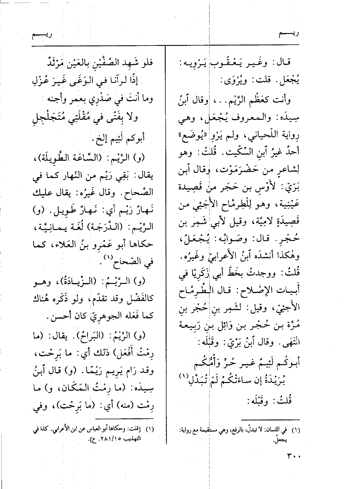 وَأَنت كعَظْم {الرَّيْم ... ، وَقَالَ اْبنُ سِيدَه: وَالْمَعْرُوف يُجْعَل، وَهِي رِواية اللّحياني، وَلم يَرْوِ " يُوضَع " أحدٌ غيرُ اْبنِ السِّكّيت. قُلتُ: وَهُوَ لِشاعرٍ من حَضْرَمَوْت، وَقَالَ اْبن بَرّيّ: لأَوْسِ بن حَجَر من قَصِيدة عَيْنِية، وَهُوَ لِلْطِرمَّاح الأَجَئِي من قَصِيدَةٍ لامِيَّة، وَقيل لأبي شَمِر بن حُجْر. قَالَ: وصَوابُه: يُجْعَلُ، وَهَكَذَا أنشَده اْبنُ الأَعرابيّ وغَيرُه. قُلتُ: ووجدتُ بخَطّ أبي زَكَرِيّا فِي أَبيات الإِصْلاح: قَالَ الطَّرِمَّاح الأَجئِيّ، وَقيل: لَشمِر بنِ حُجْر بنِ مُرَّة بن حُجْر بن وَائِل بنِ رَبِيعة انْتَهَى. وَقَالَ اْبنُ بَرِّيّ: وقَبْلَه: