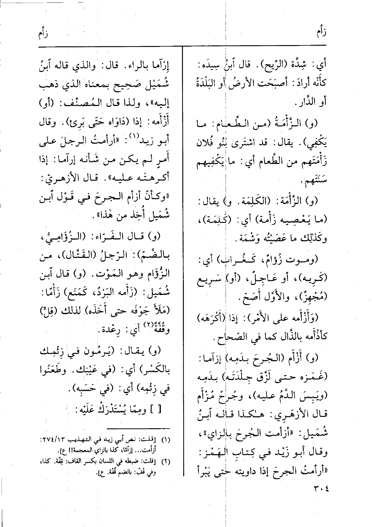 (و) {أَزْأَم (الجُرحَ بدَمِه) } إزآما: (غَمَزه حَتَّى لَزَّق جِلْدَتَه) بدَمِه (وَيَبِسَ الدَّمُ عَلَيْهِ) ، وجُرحٌ {مُزْأَم قَالَ الأزهَرِي: هَكَذَا قَالَه ابنُ شُمَيل: "} أزأمت الجُرحَ بالزاي "، وَقَالَ أَبُو زَيْد فِي كِتابِ الهَمْز: " أرأمتُ الجرحَ إِذا داويته حَتَّى يَبْرأ إِرْآما بالراء. قَالَ: وَالَّذِي قَالَه ابنُ شُمَيْل صَحِيح بِمَعْنَاهُ الَّذِي ذهب إِلَيْهِ "، وَلذَا قَالَ المُصنِّف: (أَو) {أَزْأَمه: إِذا (دَاوَاه حَتّى بَرِئ) . وَقَالَ أَبُو زيد: " أرأمتُ الرجلَ على أَمرٍ لم يكن من شَأنه إرآما: إِذا أكرهتَه عَلَيْهِ ". قَالَ الأزهريّ: " وكأنّ أزأم الجرحَ فِي قَوْل ابْن شُمَيل أُخِذ من هَذَا ".