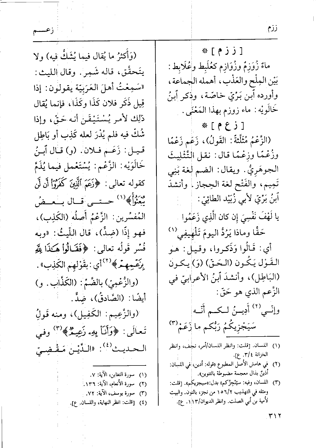 (وَأَكثرُ مَا يُقال فِيمَا يُشَكُّ فِيهِ) وَلَا يتَحقَّق، قَالَه شَمِر. وَقَالَ اللَّيْث: " سَمِعْتُ أهلَ العَرَبِيّة يَقُولُونَ: إِذا قِيل ذَكَر فلَان كَذَا وكَذَا، فَإِنَّمَا يُقال ذلِك لأمر يُسْتَيْقَن أَنه حَقّ، وَإِذا شُكّ فِيهِ فَلم يُدْرَ لَعَلَّه كَذِب أَو بَاطِل قيل: زَعَم فلَان. (و) قَالَ ابنُ خَالَوَيْه: الزَّعْم: يُسْتَعْمل فِيمَا يُذَمَّ كَقَوْلِه تَعَالَى: {زعم الَّذين كفرُوا أَن لن يبعثوا} حَتَّى قَالَ بعضُ المُفسِّرين: الزَّعْمُ أَصلُه (الكَذِب) ، فَهُوَ إِذا (ضِدٌّ) ، قَالَ اللّيثُ: " وَبِه فُسِّر قَولُه تَعَالَى: {فَقَالُوا هَذَا لله بزعمهم} أَي: بقَوْلِهم الكَذِب ".