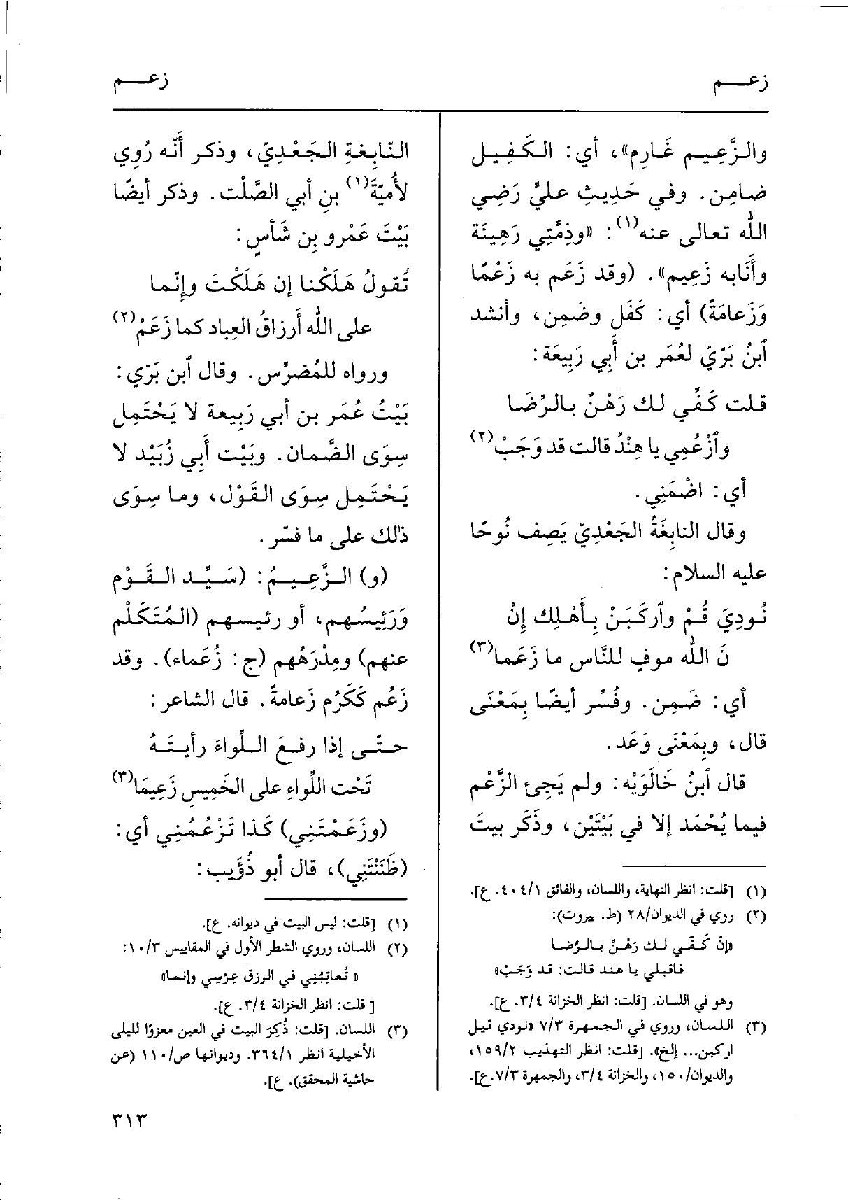 قَالَ ابنُ خَالَوَيْه: وَلم يَجِيء الزَّعْم فِيمَا يُحْمَد إِلَّا فِي بَيْتَيْن، وذَكَر بيتَ النّابِغةِ الجَعْدِيّ، وَذكر أَنَّه رُوِي لأُميّةَ بنِ أبي الصَّلْت. وَذكر أَيْضا بَيْتَ عَمْرو بِن شَأسٍ: