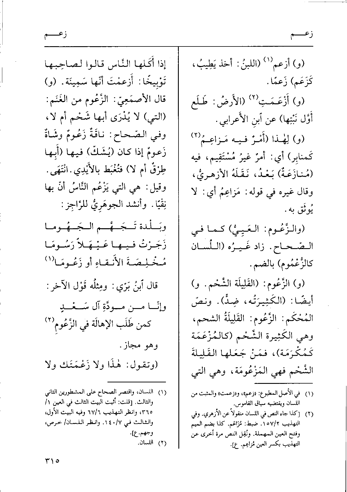 (و) الزَّعُوم: (القَلِيلَة الشَّحْم. و) أَيْضا: (الكَثِيرَتُه، ضِدٌّ) . ونصّ المُحْكَم: الزَّعُوم: القَلِيلَة الشَّحْم، وَهِي الكَثِيرة الشَّحْم (كالمُزْعَمَة كَمُكْرَمَة) ، فمَنْ جَعَلها القَلِيلةَ الشَّحْم فَهِيَ المزْعُومَة، وَهِي الَّتِي إِذا أَكَلها النَّاس قَالُوا لصاحِبها تَوْبِيخاً: أَزْعمْتَ أنّها سَمِينَة. (و) قَالَ الأصمَعِيّ: الزَّعُوم من الغَنَم: (الَّتِي) لَا يُدْرَى أَبِهَا شَحْم أم لَا، وَفِي الصّحاح: ناقَةٌ زَعُومٌ وشَاةٌ زَعومٌ إِذا كَانَ (يُشَكّ) فِيهَا (أَبِها طِرْقٌ أم لَا) فتُغْبَط بالأَيْدِي. انْتَهَى.