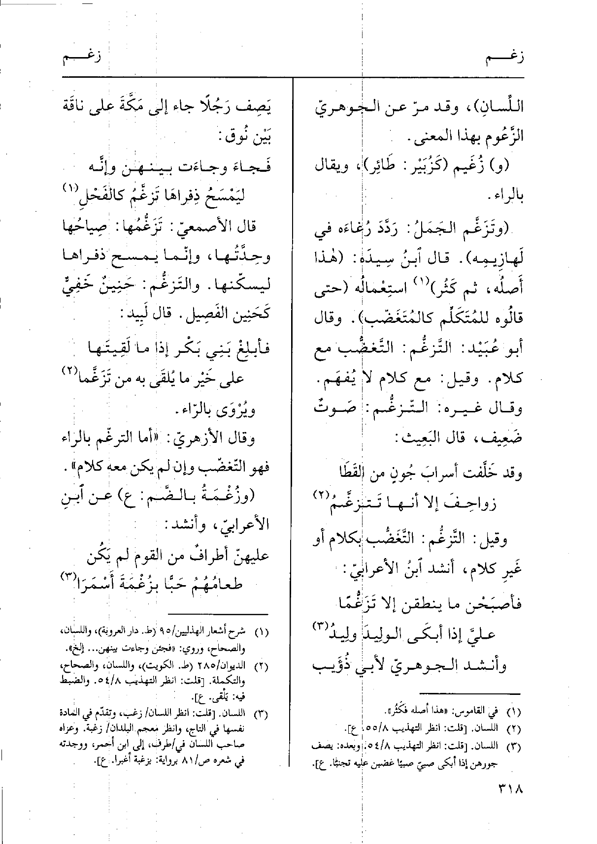 قَالَ الأصمعيّ: تَزَغُّمُها: صِياحُها وحِدَّتُها، وإنّما يمسح ذفراها ليسكّنها. والتَزغُّم: حَنِينٌ خَفِيٌّ كَحَنِين الفَصِيل. قَالَ لَبِيد:
