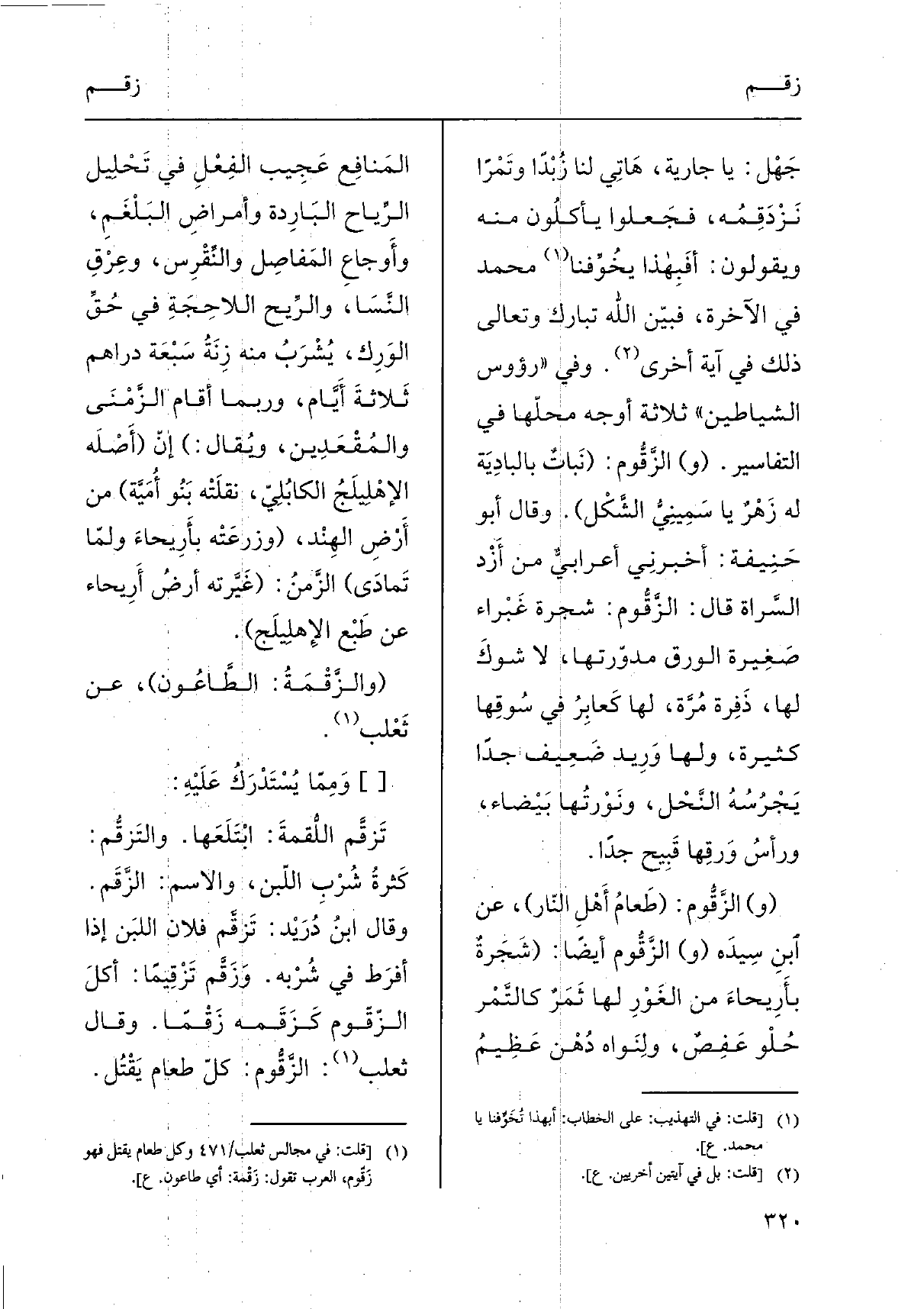 (و) الزَّقُّوم: (طَعامُ أَهْلِ النّار) ، عَن اْبنِ سِيدَه (و) الزَّقُوم أَيْضا: (شَجَرةٌ بأَرِيحاءَ من الغَوْرِ لَهَا ثَمَرٌ كالتَّمْر حُلْو عَفِصٌ، ولِنَواه دُهْن عَظِيمُ المَنافِع عَجِيب الفِعْلِ فِي تَحْليل الرِّياح البَارِدة وأمراضِ البَلْغَمِ، وأَوجاع المَفاصِل والنِّقْرِس، وعِرْقِ النَّسَا، والرِّيح اللاحِجَةِ فِي حُقِّ الوَرِك، يُشْرَبُ مِنْهُ زِنَةُ سَبْعَة دَرَاهِم ثَلاثةَ أَيَّام، وَرُبمَا أَقَامَ الزَّمْنَى والمُقْعَدِين، ويُقال:) إنّ (أَصْلَه الإهْلِيلَجُ الكابُلِيّ، نقلَتْه بَنُو أُمَيَّة) من أَرْضِ الهِنْد، (وزرعَتْه بأَرِيحاءَ ولمّا تَمادَى) الزَّمنُ: (غَيَّرته أرضُ أَرِيحاء عَن طَبْع الإِهلِيلَج) .