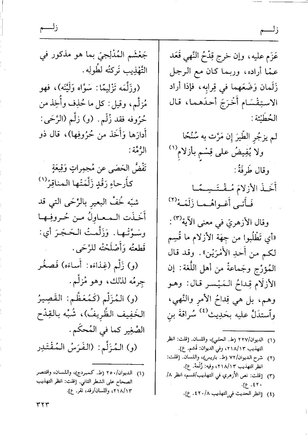 وَقَالَ الأزهريّ فِي معنى الْآيَة: " أَي تَطْلُبوا من جِهَة الأزلام مَا قُسِم لكم من أَحدِ الأَمْرَيْن ". وَقد قَالَ المُؤرَّج وجَماعةٌ من أهل اللُّغة: إِن الأزلاَم قِداحُ المَيْسر قَالَ: وَهُوَ وهم، بل هِيَ قِداحُ الأمرِ والنَّهي، واْستدَلَّ عَلَيْهِ بحَدِيث سُراقةَ بنِ جَعْشَم المُدْلَجِيّ بِمَا هُوَ مَذْكُور فِي التَّهْذِيب تَركتُه لطُولِه.
