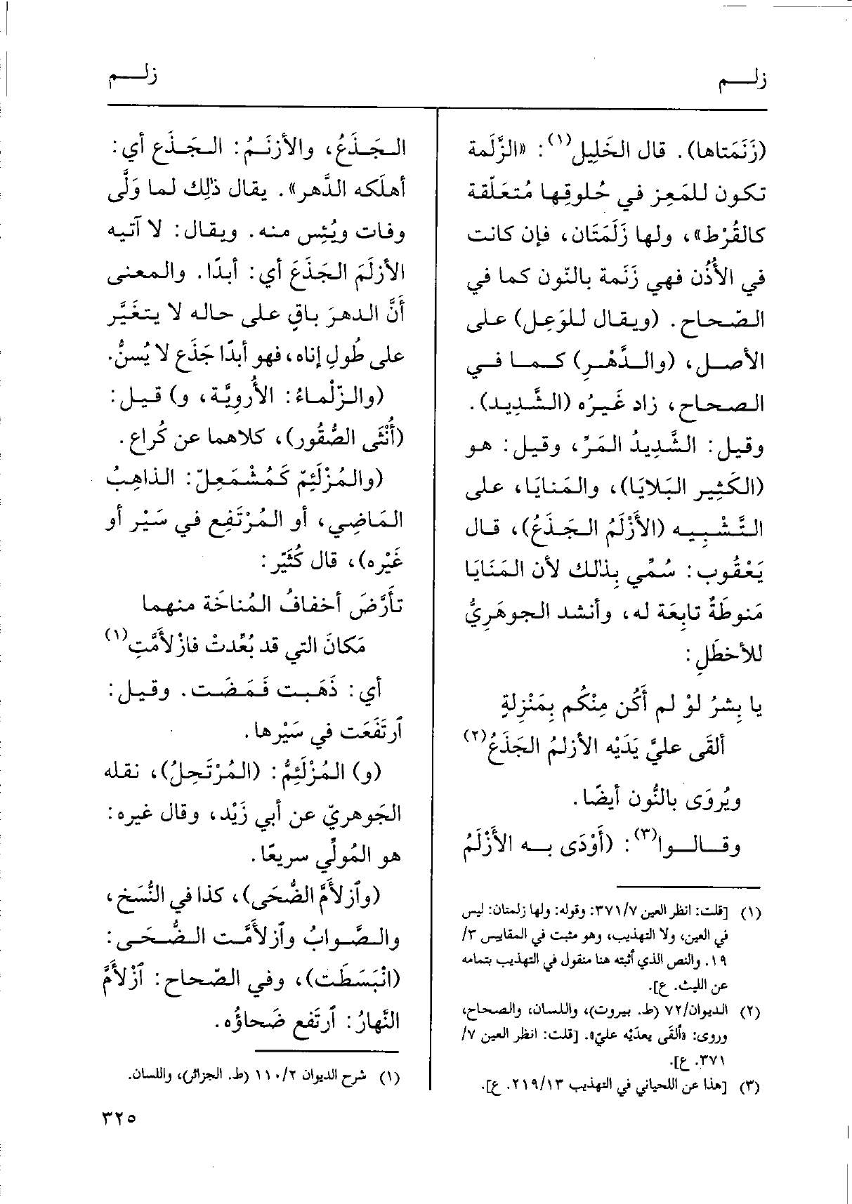(زَنَمَتاها) . قَالَ الخَلِيل: " الزَّلَمة تكون للمَعِز فِي حُلوقِها مُتعَلّقة كالقُرْط "، وَلها زَلَمَتَان، فَإِن كَانَت فِي الأُذُن فَهِيَ زَنَمة بالنّون كَمَا فِي الصّحاح. (وَيُقَال للوَعِل) على الأَصْل، (والدَّهْرِ) كَمَا فِي الصِّحَاح، زَاد غَيرُه (الشَّدِيد) . وَقيل: الشَّدِيدُ المَرِّ، وَقيل: هُوَ (الكَثِير البَلايَا) ، والمَنايَا، على التَّشْبِيه (الأَزْلَمُ الجَذَعُ) ، قَالَ يَعْقُوب: سُمِّي بِذلك لِأَن المَنَايَا مَنوطَةٌ تابِعَة لَهُ، وَأنْشد الجوهَرِيُّ للأخطَلِ:
