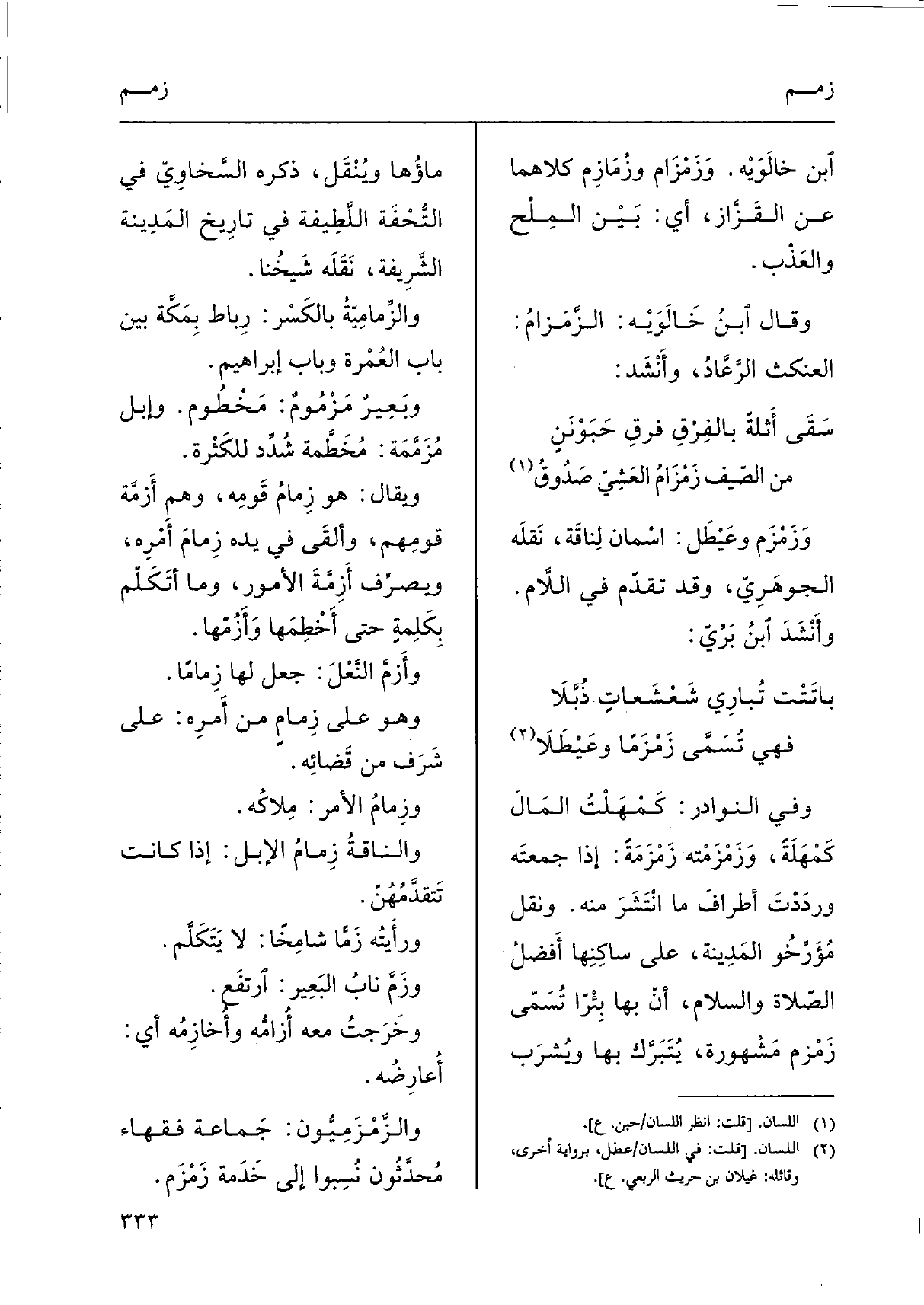 وَفِي النَّوَادِر: كَمْهَلْتُ المَالَ كَمْهَلَةً، {وَزَمْزَمْته} زَمْزَمَةً: إِذا جمعتَه وردَدْت أطرافَ مَا انْتَشَر مِنْهُ. وَنقل مُؤَرِّخُو المَدِينة، على ساكِنِها أَفضلُ الصّلاة وَالسَّلَام، أنّ بهَا بِئْرًا تُسَمَّى زَمْزم مَشْهورة، يُتَبَرَّك بهَا ويُشرَب ماؤُها ويُنْقَل، ذكره السَّخاوِيّ فِي التُّحْفَة اللَّطِيفة فِي تارِيخ المَدِينة الشَّرِيفة، نَقَلَه شَيخُنا.