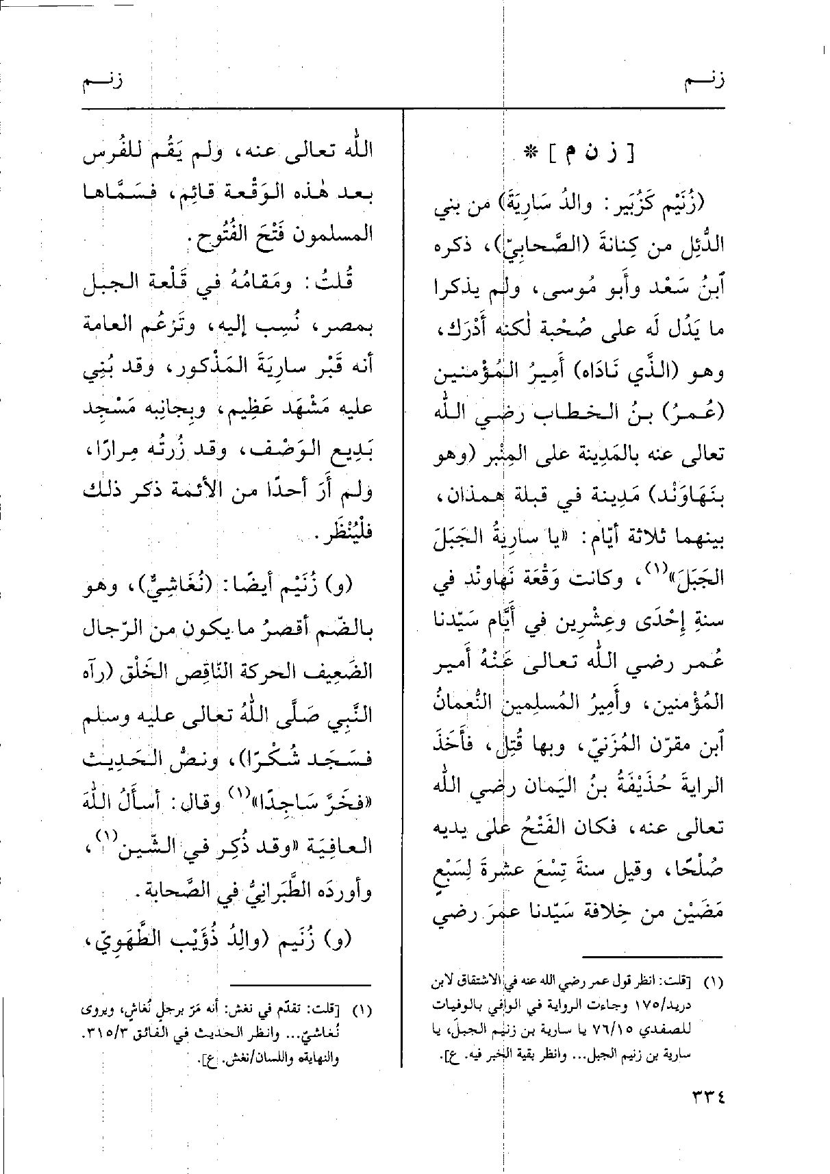 (زُنَيْم كَزُبَير: والدُ سَارِيَةَ) من بني الدُّئِل من كِنانةَ (الصَّحابِيّ) ، ذكره ابنُ سَعْد وأَبو مُوسى، وَلم يذكرَا مَا يَدُل لَه على صُحْبة لكنه أَدْرَك، وَهُوَ (الَّذي نَادَاه) أَمِيرُ المُؤْمنين (عُمرُ) بنُ الْخطاب رَضِي الله تَعَالَى عَنهُ بالمَدِينة على المِنْبر (وَهُوَ بنَهَاوَنْد) مَدِينة فِي قبْلَة همذان، بَينهمَا ثَلَاثَة أيّام: " يَا سارِيةُ الجَبَلَ الجَبَلَ "، وَكَانَت وَقْعَة نَهاونْد فِي سنةِ إِحْدَى وعِشْرِين فِي أيَّام سَيّدنا عُمر رَضِي الله تَعَالَى عَنْهُ أَمير المُؤْمنين، وأَمِيرُ المُسلِمين النُّعمانُ ابْن مقرّن المُزَنيّ، وَبهَا قُتِل، فأَخَذَ الرايةَ حُذَيْفَةُ بنُ اليَمان رَضِي الله تَعَالَى عَنهُ، فَكَانَ الفَتْحُ على يَدَيْهِ صُلْحًا، وَقيل سنةَ تِسْعَ عشرةَ لِسَبْعٍ مَضَيْن من خِلافة سَيّدنا عمرَ رَضِي الله تَعَالَى عَنهُ، وَلم يَقُم للفُرس بعد هَذِه الوَقْعة قائِم، فسَمَّاها الْمُسلمُونَ فَتْحَ الفُتُوح.