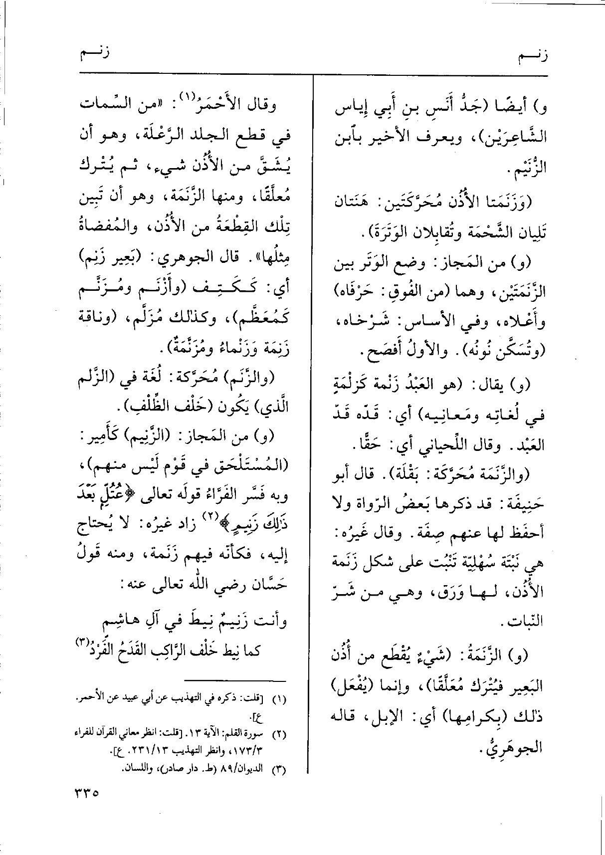 وَقَالَ الأَحْمَرُ: " من السِّمات فِي قطع الْجلد الرَّعْلَة، وَهُوَ أَن يُشَقَّ من الأُذُن شَيْء، ثمَّ يُتْرك مُعلَّقًا، وَمِنْهَا الزَّنَمَة، وَهُوَ أَن تَبِين تِلْك القِطْعَةُ من الأُذُن. والمُفضاةُ مِثلُها ". قَالَ الْجَوْهَرِي: (بَعِير زَنِم) أَي: كَكَتِف (وأَزْنَم ومُزَنَّم كَمُعَظَّم) ، وَكَذَلِكَ مُزَلَّم، (وناقة زَنِمَة وَزَنْماءُ ومُزَنّمَةٌ) .