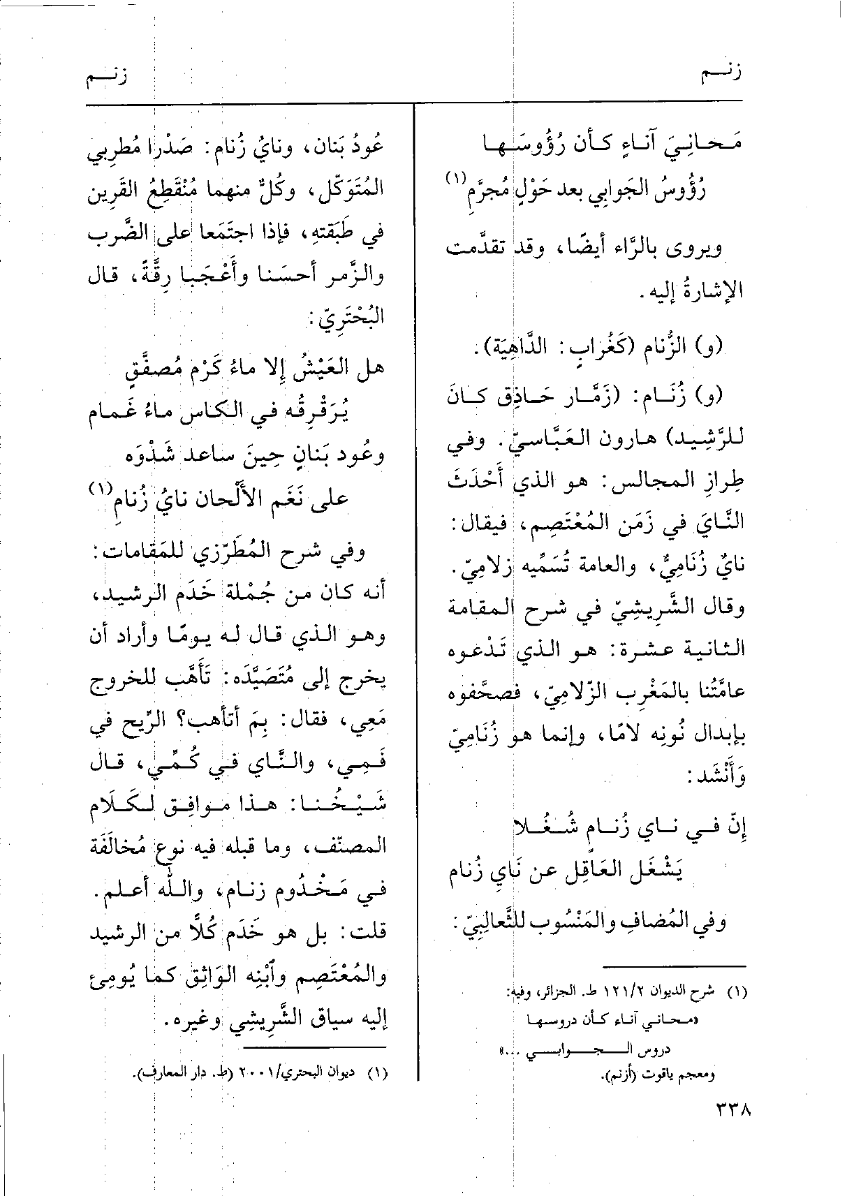وَفِي المُضافِ والمَنْسُوب للثَّعالِبِيّ: عُودُ بَنان، ونايُ زُنام: صَدْرا مُطرِبي المُتَوَكّل، وكُلُّ مِنْهُمَا مُنْقَطِعُ القَرِين فِي طَبَقَتِه، فَإِذا اجْتَمَعا على الضَّرب والزَّمر أحسَنا وأَعْجَبا رِقَّةً، قَالَ البُحْتَرِيّ: