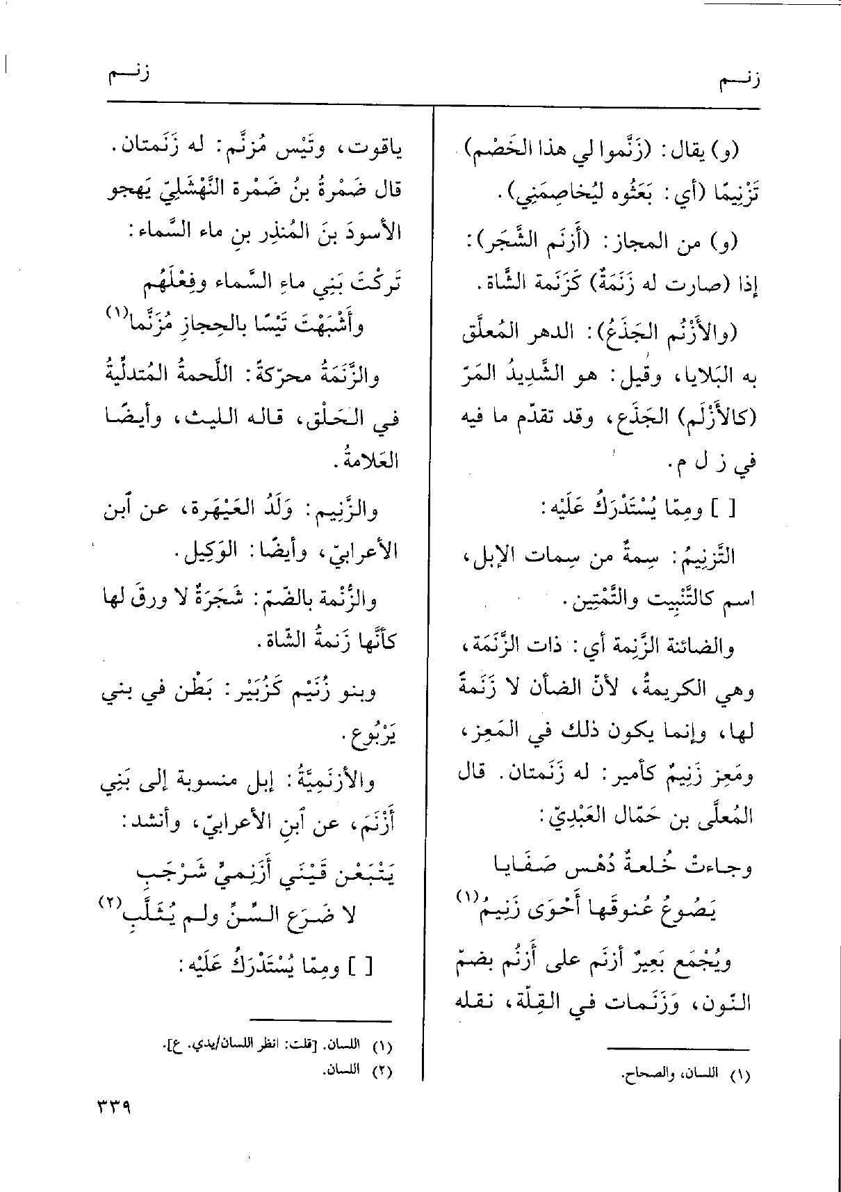 ويُجْمَع بَعِيرٌ أزنَم على أَزنُم بضمّ النّون، وَزَنَمات فِي القِلّة، نَقله ياقوت، وتَيْس مُزنَّم: لَهُ زَنمَتان. قَالَ ضَمْرةُ بنُ ضَمْرة النَّهْشَلِيّ يَهجو الأسودَ بنَ المُنذِر بنِ مَاء السَّماء: