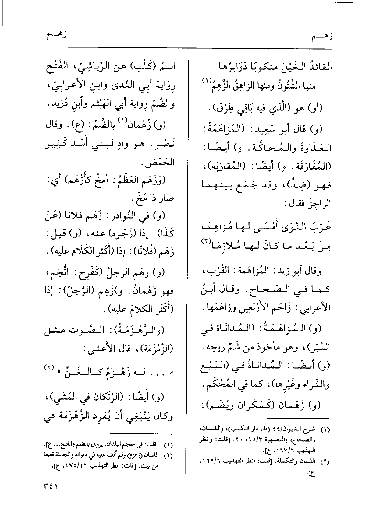 (و) المُزاهَمَةُ: (المُدانَاة فِي السَّيْر) ، وَهُوَ مَأْخُوذ من شَمّ ريحِه. (و) أَيْضا: المُداناةُ فِي (البَيْع والشّراء وغَيْرِها) ، كَمَا فِي المُحْكَم. (و) زَهْمان (كَسَكْران ويُضَم) : اسمُ (كَلبْ) عَن الرِّياشِيّ، الفَتْح رِوَاية أبِي النّدى وابنِ الأعرابِيّ، والضَّمّ رِواية أبي الهَيْثم وابنِ دُرَيد.