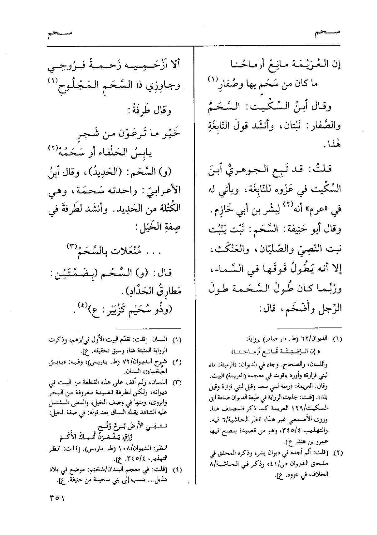 قلتُ: قد تَبِع الجوهريُّ اْبنَ السِّكِّيت فِي عَزْوه للنّابِغَة، وَيَأْتِي لَهُ فِي " عرم " أَنه لِبشْر بن أبي خَازِم. وَقَالَ أَبُو حَنِيفة: السَّحَم: نَبْت يُنْبُت نبت النّصِيّ والصّليّان، والعَنْكَث، إِلَّا أَنه يَطُولُ فَوقَها فِي السَّماء، ورُبَّما كَانَ طُولُ السَّحَمة طولَ الرَّجل وأَضْخَم، قَالَ: