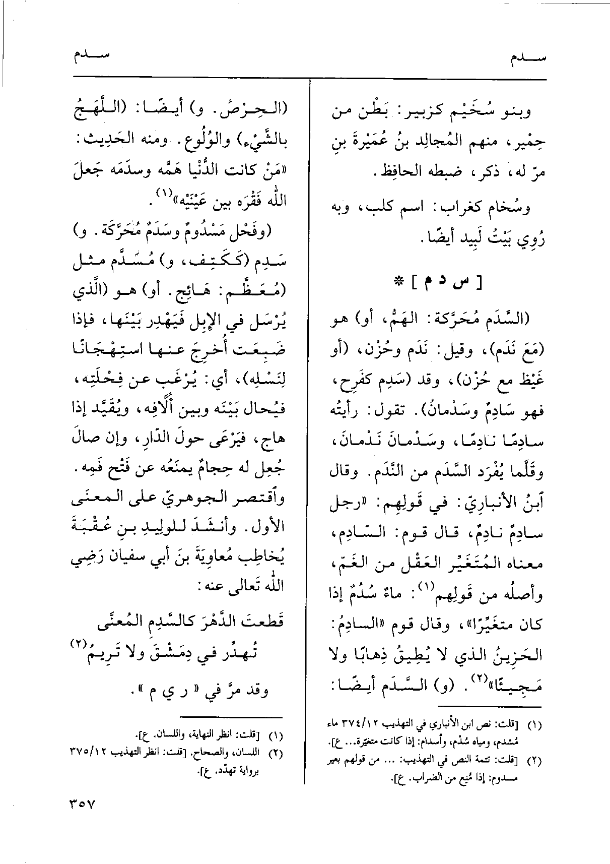 (وفَحْل مَسْدُومٌ وسَدَمٌ مُحَرَّكَة. و) سَدِم (كَكَتِف، و) مُسَدَّم مثل (مُعَظَّم: هَائِج. أَو) هُوَ (الَّذي يُرْسَل فِي الإِبِل فَيَهْدِر بَيْنَها، فَإِذا ضَبِعَت أُخرِجَ عَنْهَا استِهْجَاناً لِنَسْلِه) ، أَي: يُرْغَب عَن فِحْلَتِه، فيُحال بَيْنَه وَبَين أُلاَّفِه، ويُقَيَّد إِذا هاج، فيَرْعَى حولَ الدّارِ، وَإِن صالَ جُعِل لَهُ حِجامٌ يمنَعُه عَن فَتْح فَمِه. واْقتصر الجوهريّ على المعنَى الأول. وأنشَدَ للولِيدِ بنِ عُقْبَةَ يُخاطِب مُعاوِيَةَ بنَ أبي سُفْيَان رَضِي الله تَعالى عَنهُ: