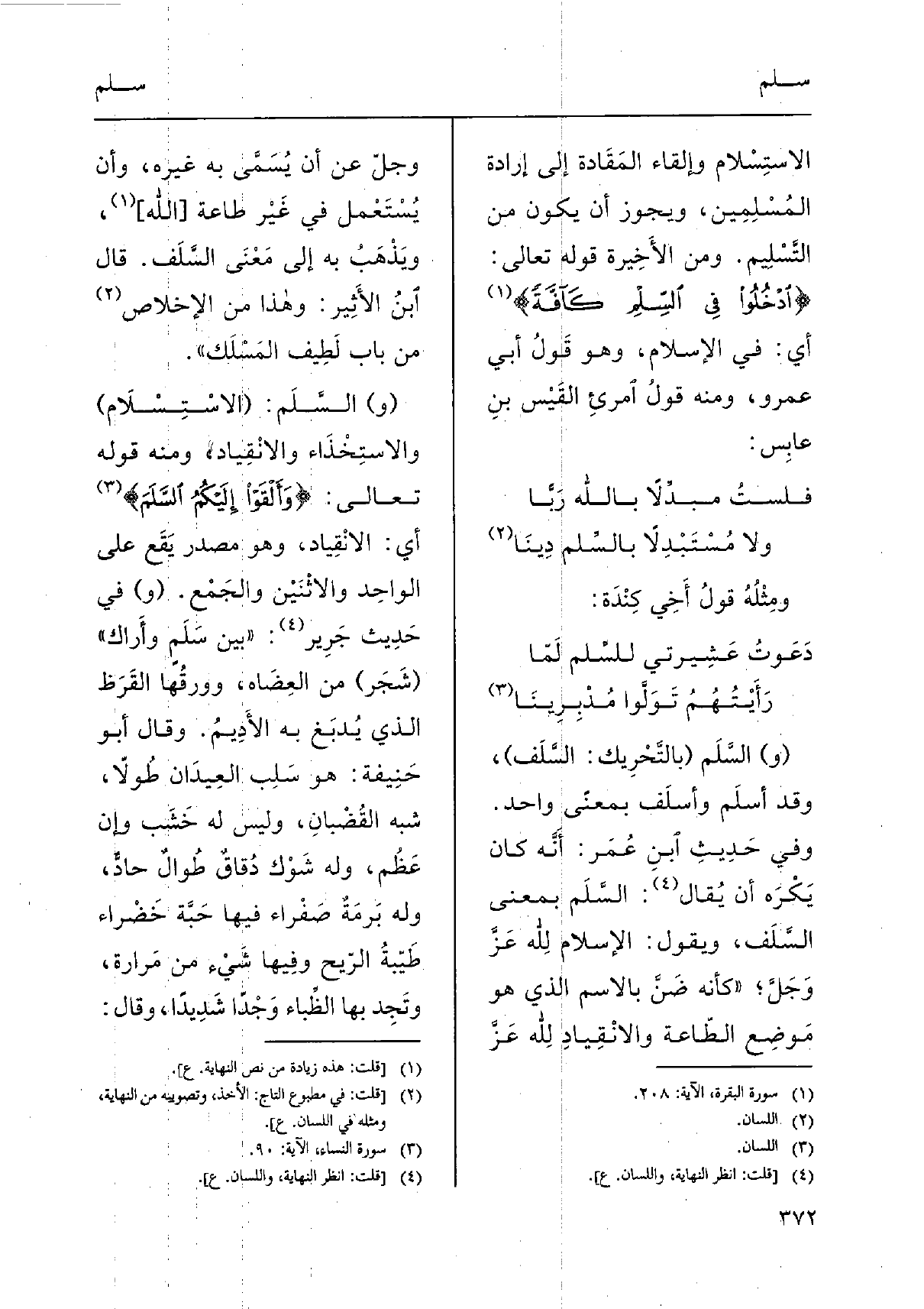 الاستِسْلام وإلقاء المَقَادة إِلَى إِرَادَة المُسْلِمِين، وَيجوز أَن يكون من التَّسْلِيم. وَمن الأَخِيرة قَوْله تَعَالَى: {ادخُلُوا فِي السّلم كَافَّة} أَي: فِي الْإِسْلَام، وَهُوَ قَولُ أبي عَمْرو، وَمِنْه قولُ امرئِ القَيْس بنِ عابِس: