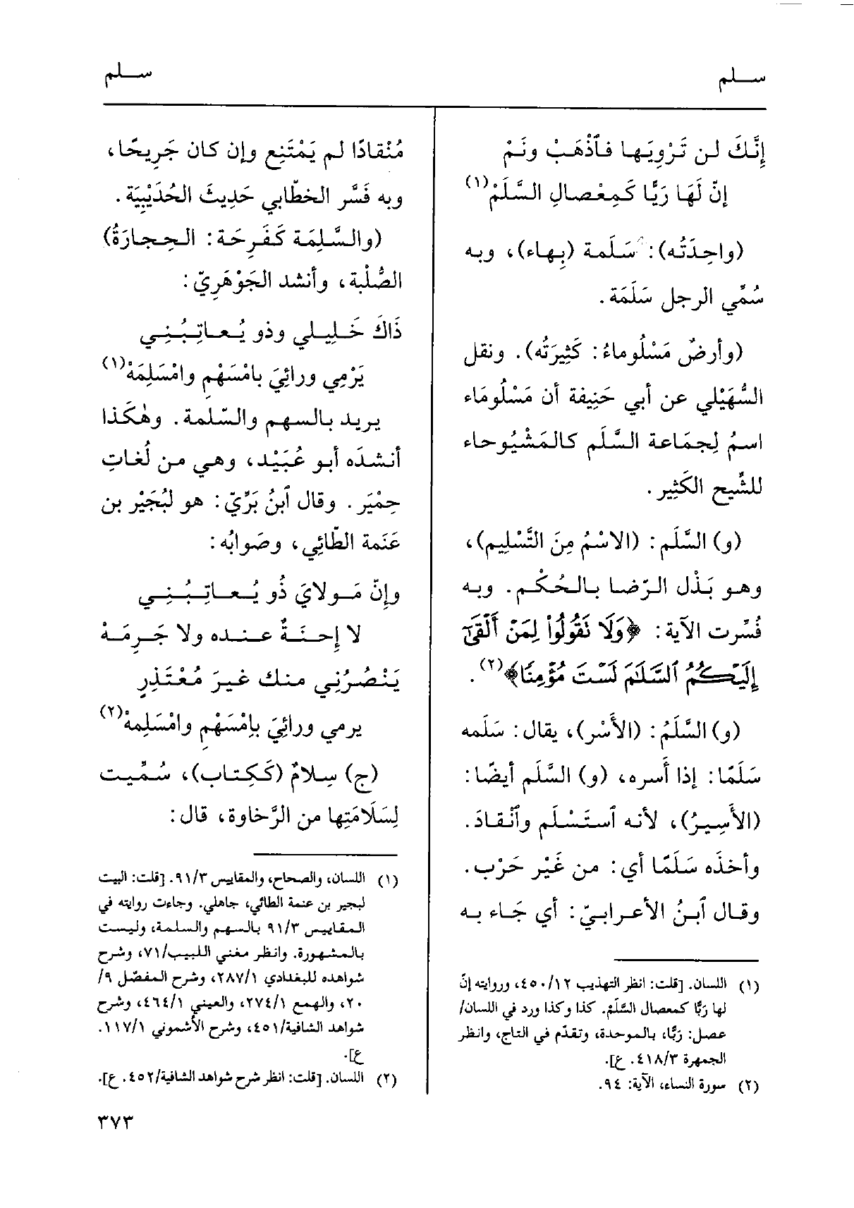 يُرِيد بِالسَّهْمِ والسّلمة. وَهَكَذَا أنشدَه أَبُو عُبَيْد، وَهِي من لُغاتِ حِمْيَر. وَقَالَ ابنُ بَرِّيّ: هُوَ لبُجَيْر بن عَنَمة الطّائِي، وصَوابُه: