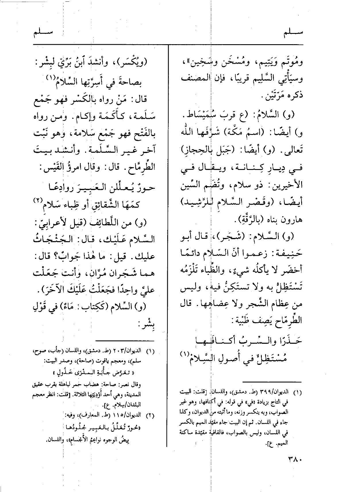 قَالَ: مَنْ رَوَاهُ بالكَسْر فَهُوَ جَمْع سَلَمة، كأَكَمَة وإكام. وَمن رَوَاهُ بالفَتْح فَهُوَ جَمْع سَلامة، وَهُوَ نَبْت آخر غير السَّلَمة، وَأنْشد بيتَ الطِّرِمَّاح. قَالَ: وَقَالَ امرؤُ القَيْس:
