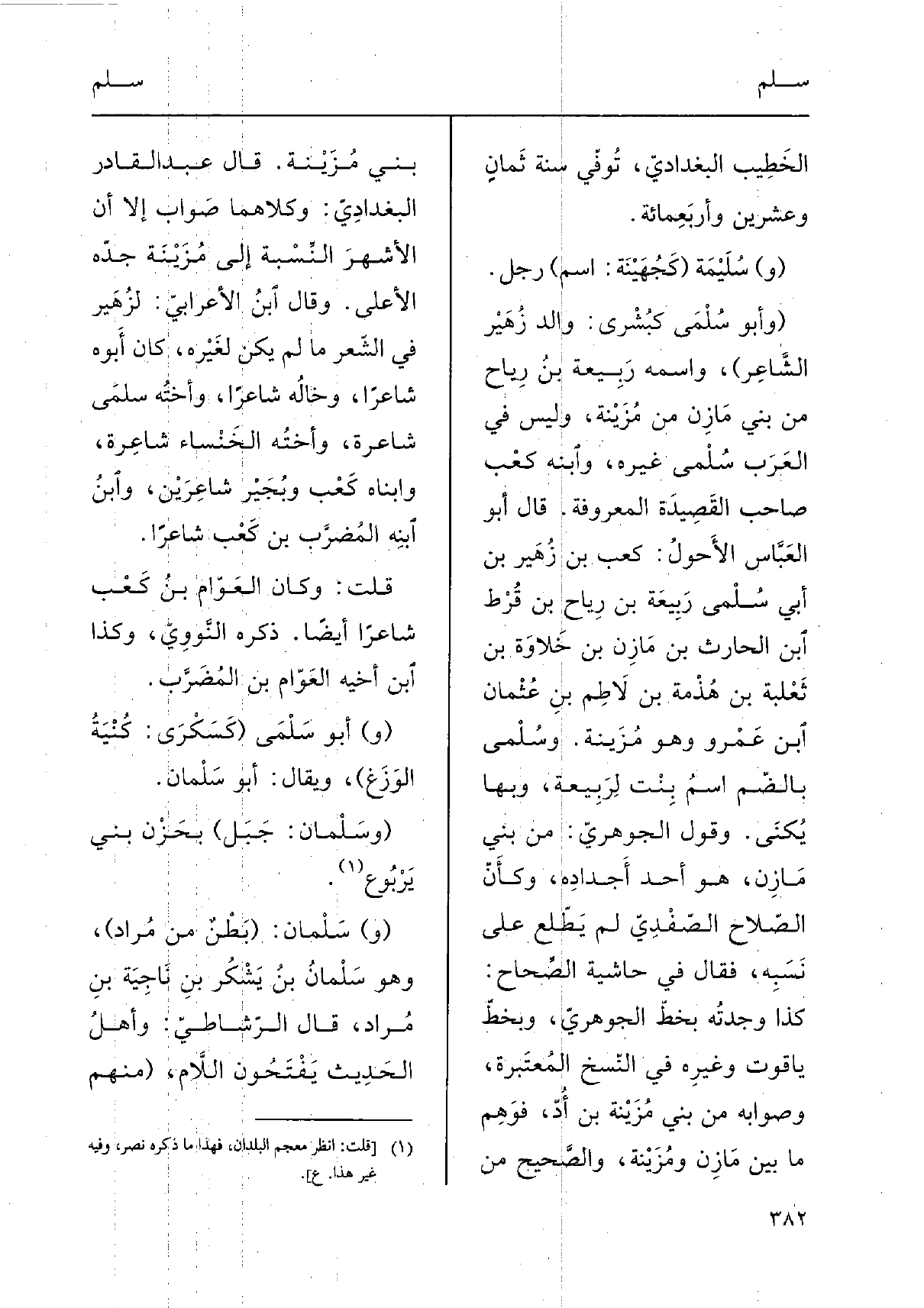 (وَأَبُو سُلْمَى كبُشْرى: وَالِد زُهَيْر الشَّاعِر) ، واسْمه رَبِيعة بنُ رِياح من بني مَازِن من مُزَيْنة، وَلَيْسَ فِي العَرَب سُلْمى غَيره، واْبنه كعْب صَاحب القَصِيدَة الْمَعْرُوفَة. قَالَ أَبُو العَبَّاس الأَحولُ: كَعْب بن زُهَير بن أبي سُلْمى رَبِيعَة بن رِياح بن قُرْط اْبن الْحَارِث بن مَازِن بن خَلاوَة بن ثَعْلبة بن هُذْمة بن لاَطِم بنِ عُثْمان اْبن عَمْرو وَهُوَ مُزَينة. وسُلْمى بالضّم اسمُ بِنْت لِرَبِيعة، وَبهَا يُكنَى. وَقَول الجوهريّ: من بني مَازِن، هُوَ أحد أَجدادِه، وكأَنّ الصّلاح الصّفْدِيّ لم يَطّلع على نَسَبِه، فَقَالَ فِي حَاشِيَة الصِّحاح: كَذَا وجدتُه بخطّ الجوهريّ، وبخطّ ياقوت وغيرِه فِي النّسخ المُعتَبرة، وَصَوَابه من بني مُزَيْنة بن أُدّ، فوَهِم مَا بَين مَازِن ومُزَيْنة، والصَّحيح من بني مُزَيْنة. قَالَ عبد الْقَادِر البغدادِيّ: وَكِلَاهُمَا صَواب إِلَّا أَن الأشهرَ النِّسْبة إِلَى مُزَيْنَة جدّه الْأَعْلَى. وَقَالَ اْبنُ الأعرابيّ: لزُهَير فِي الشّعر مَا لم يكن لغَيْره، كَانَ أَبوه شَاعِرًا، وخالُه شَاعِرًا، وأختُه سلمَى شاعرة، وأختُه الخَنْساء شاعِرة، وابناه كَعْب وبُجَيْر شاعِرَيْن، واْبنُ اْبنِه المُضرَّب بن كَعْب شَاعِرًا.