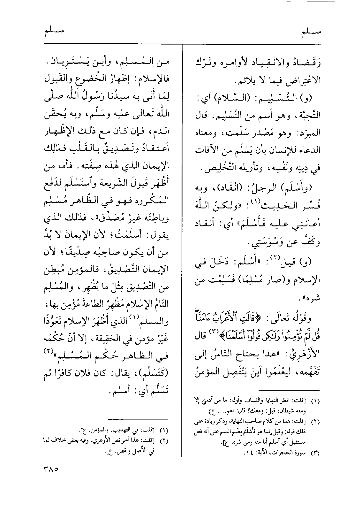 وقَوْلُه تَعالَى: {قَالَتِ اْلأَعْرَابُءَامَنَّا قُل لَّمْ تُؤْمِنُواْ وَلَكِن قُولُواْ أَسْلَمْنَا} قَالَ الأَزْهَرِيُّ: " هَذَا يحْتَاج النّاسُ إِلَى تَفَهُّمه، ليَعْلَمُوا أينَ يَنْفَصِل المؤمنُ من المُسلِم، وَأَيْنَ يَسْتَوِيان. فالإسلام: إظهارُ الخُضوعِ والقَبول لِمَا أَتَى بِهِ سيدُنا رَسُولُ الله [