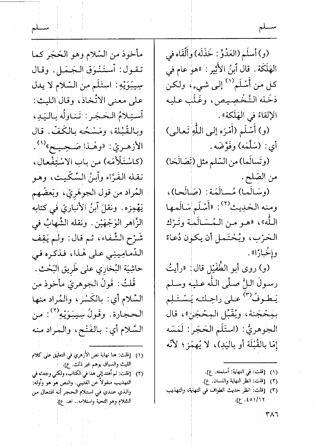 ] يَطوفُ على راحِلته يَسْتَلِم بمِحْجَنة، ويُقْبِّل المِحْجَن "، قَالَ الجوهريُّ: (استَلَم الحَجَر: لَمَسَه إِمّا بالقُبْلَة أَو باليَدِ) ، لَا يُهمَز؛ لأنّه مَأْخُوذ من السّلام وَهُوَ الحَجَر كَمَا تَقول: اْستَنْوَق الجَمَل. وَقَالَ سِيبَوَيْهِ: استَلَم من السّلام لَا يدل على معنى الاتِّخاذ، وَقَالَ اللَّيْث: اْستِلامُ الحَجَر: تَناولُه باليَدِ، وبالقُبْلة، ومَسْحُه بالكَفّ. قَالَ الأزهريّ: " وَهَذَا صَحِيح ". (كاسْتَلأَمَه) من بَاب الاسْتِفْعال، نَقله الفَرَّاء واْبنُ السِّكّيت، وَهُوَ المُراد من قَول الجوهَرِيّ، وبَعضُهم يَهْمِزه. ونقلَ اْبنُ الأنباريّ فِي كِتَابه الزَّاهر الوَجْهَيْن. وَنَقله الشِّهابُ فِي شَرْح الشَّفاء، ثمَّ قَالَ: وَلم يَقِف الدّمامِينيِ على هَذَا، فَذكره فِي حاشِيَة البُخارِي على طَرِيق البَحْث.