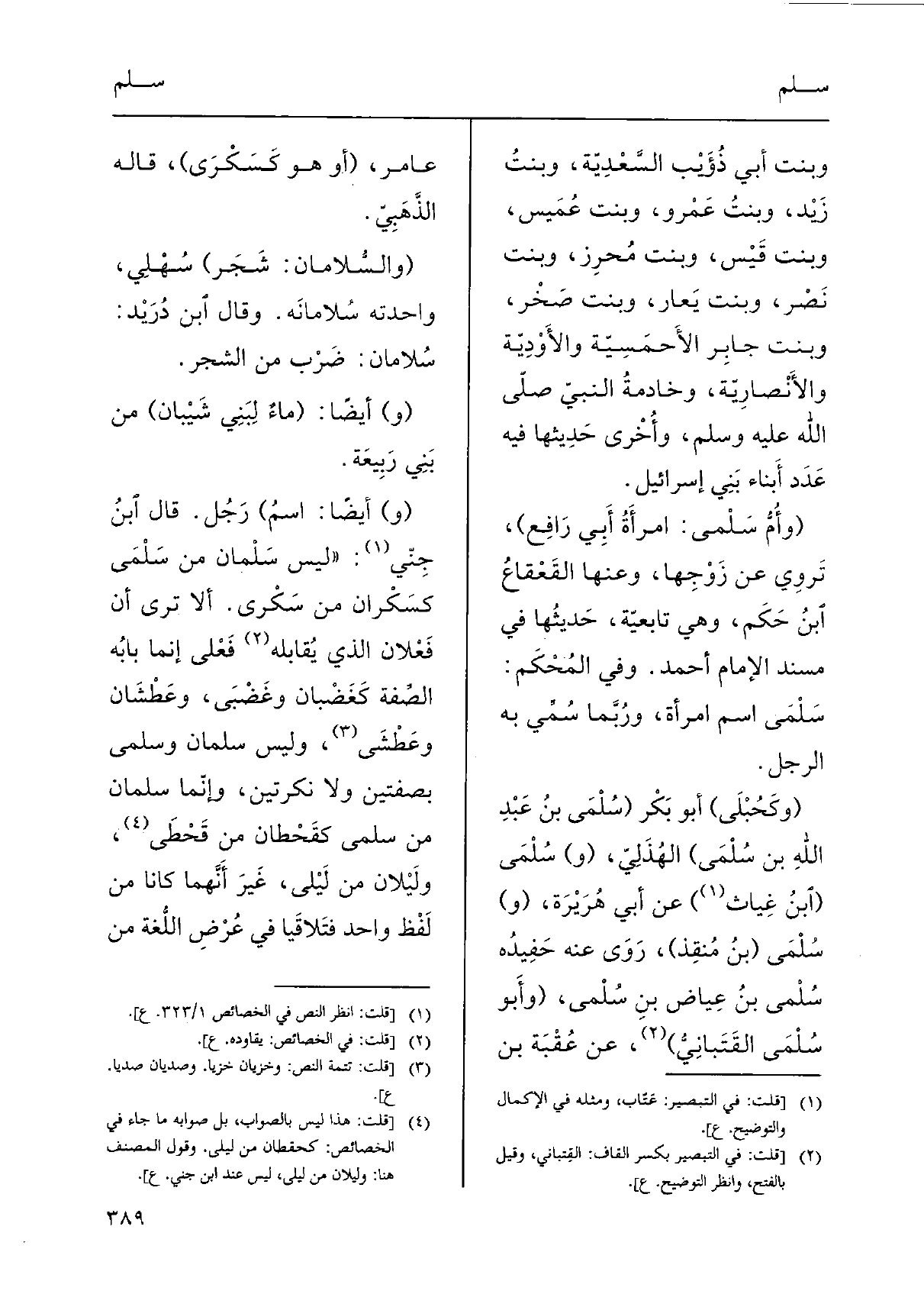 (و) أَيْضا: اسمُ) رَجُل. قَالَ اْبنُ جِنّي: " لَيْسَ سَلْمان من سَلْمَى كسَكْران من سَكْرى. أَلا ترى أَن فَعْلان الَّذِي يُقابله فَعْلى إِنَّمَا بابُه الصِّفة كَغَضْبان وغَضْبَى، وعَطْشَان وعَطْشَى، وَلَيْسَ سلمَان وسلمى بصفتين وَلَا نكرتين، وإنّما سلمَان من سلمى كقَحْطان من قَحْطَى، ولَيلان من لَيْلى، غَيرَ أَنَّهما كَانَا من لَفْظ وَاحِد فتَلاقَيا فِي عُرْضِ اللُّغة من