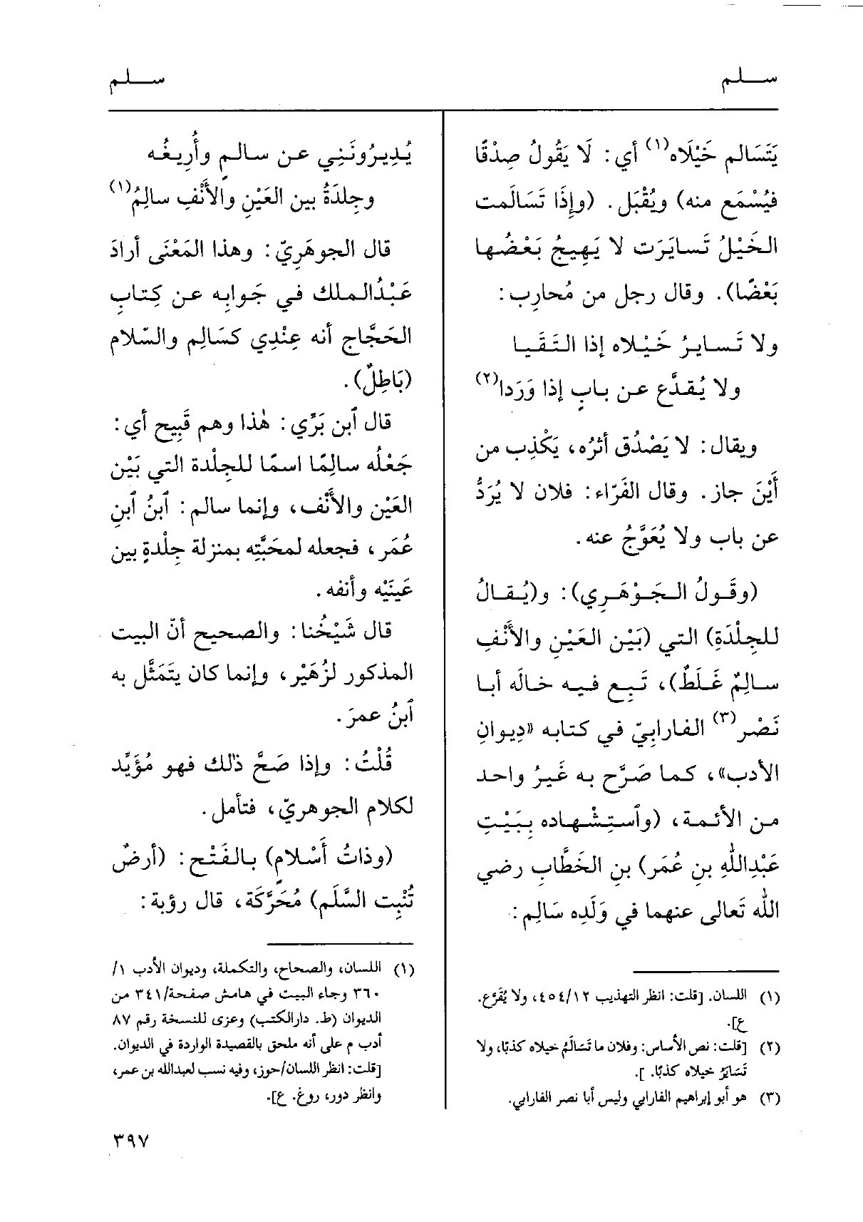 (وقَولُ الجَوْهَرِي) : و (يُقالُ للجِلْدَةِ) الَّتِي (بَيْن العَيْنِ والأَنْفِ سالِمٌ غَلَطٌ) ، تَبِع فِيهِ خالَه أَبَا نَصْر الفارابِيّ فِي كِتَابه " دِيوانِ الْأَدَب "، كَمَا صَرَّح بِهِ غَيرُ وَاحِد من الْأَئِمَّة، (واْستِشْهاده بِبَيْتِ عَبْدِ اللهِ بنِ عُمَر) بنِ الخَطَّابِ رَضِي الله تَعالى عَنْهُمَا فِي وَلَدِه سَالِم: