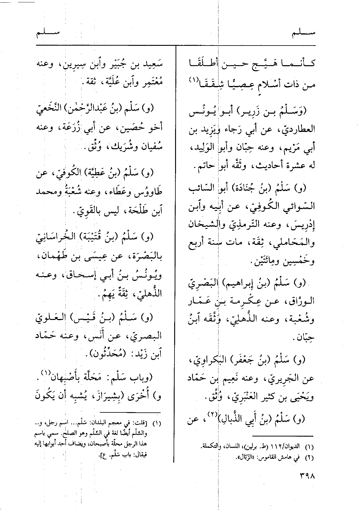 (و) سَلْم (بنُ عَبْد الرَّحْمن) النَّخَعيّ أَخُو حُصَين، عَن أبي زُرَعَة، وَعنهُ سُفيان وشُرَيك، وُثِّق.