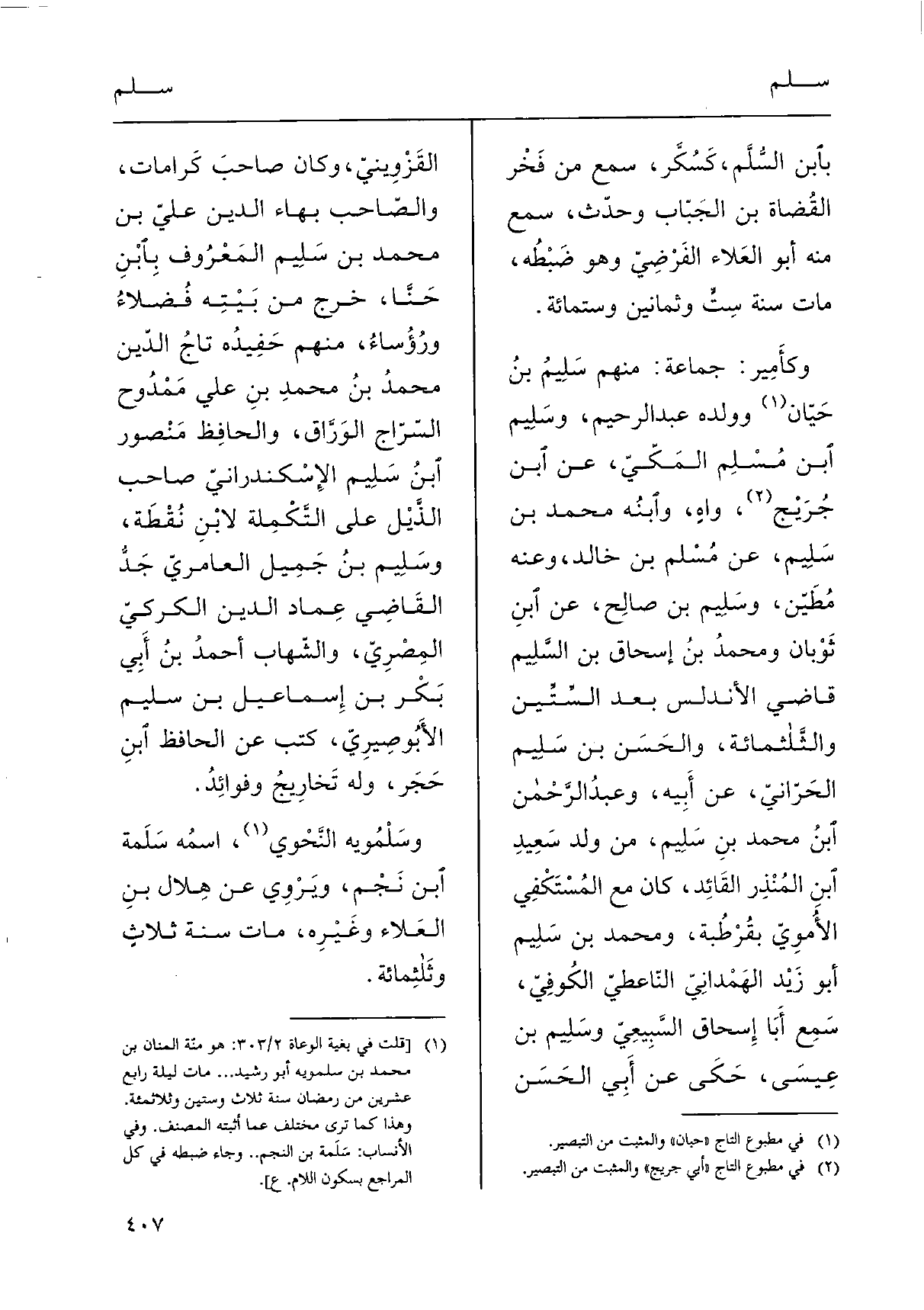 وكأَمِير: جمَاعَة: مِنْهُم سَلِيمُ بنُ حَيّان وَولده عبد الرَّحِيم، وسَلِيم اْبن مُسْلِم المَكّيّ، عَن اْبن جُرَيْج، واهٍ، واْبنُه مُحَمَّد بن سَلِيم، عَن مُسْلم بن خَالِد، وَعنهُ مُطَيّن، وسَلِيم بن صالِح، عَن اْبنِ ثَوْبان ومحمدُ بنُ إِسْحَاق بن السَّلِيم قَاضِي الأندلس بعد السِّتِّين والثَّلثمائة، والحَسَن بن سَلِيم الحَرّانيّ، عَن أَبِيه، وعبدُ الرَّحْمن اْبنُ مُحَمَّد بنِ سَلِيم، من ولد سَعِيدِ اْبنِ المُنْذِر القَائِد، كَانَ مَعَ المُسْتَكْفِي الأُموِيّ بقُرْطُبة، وَمُحَمّد بن سَلِيم أَبُو زَيْد الهَمْدانِيّ النَاعطيّ الكُوفِيّ، سَمِع أَبَا إِسحاق السَّبِيعِيّ وسَلِيم بن عِيسَى، حَكَى عَن أَبِي الحَسَن القًزْوِينيّ، وَكَانَ صاحبَ كَرامات، والصّاحب بهاء الدّين عليّ بن مُحَمَّد بن سَلِيم المَعْرُوف بِاْبْنِ حَنَّا، خرج من بَيْتِه فُضلاءُ ورُؤُساءُ، مِنْهُم حَفِيدُه تاجُ الدّين محمدُ بنُ محمدِ بنِ عَليّ مَمْدُوح السّرّاج الوَرَّاق، والحافِظ مَنْصور اْبنُ سَلِيم الإِسْكندرانيّ صَاحب الذَّيْل على التَّكْمِلة لابْنِ نُقْطَة، وسَلِيم بنُ جَمِيل العامريّ جَدُّ القَاضِي عِماد الدّين الكركيّ المِصْرِيّ، والشّهاب أحمدُ بنُ أَبِي بَكْر بن إِسماعيل بن سليم الأَبُوصِيرِيّ، كتب عَن الْحَافِظ اْبنِ حَجَر، وَله تَخارِيجُ وفوائِدُ.