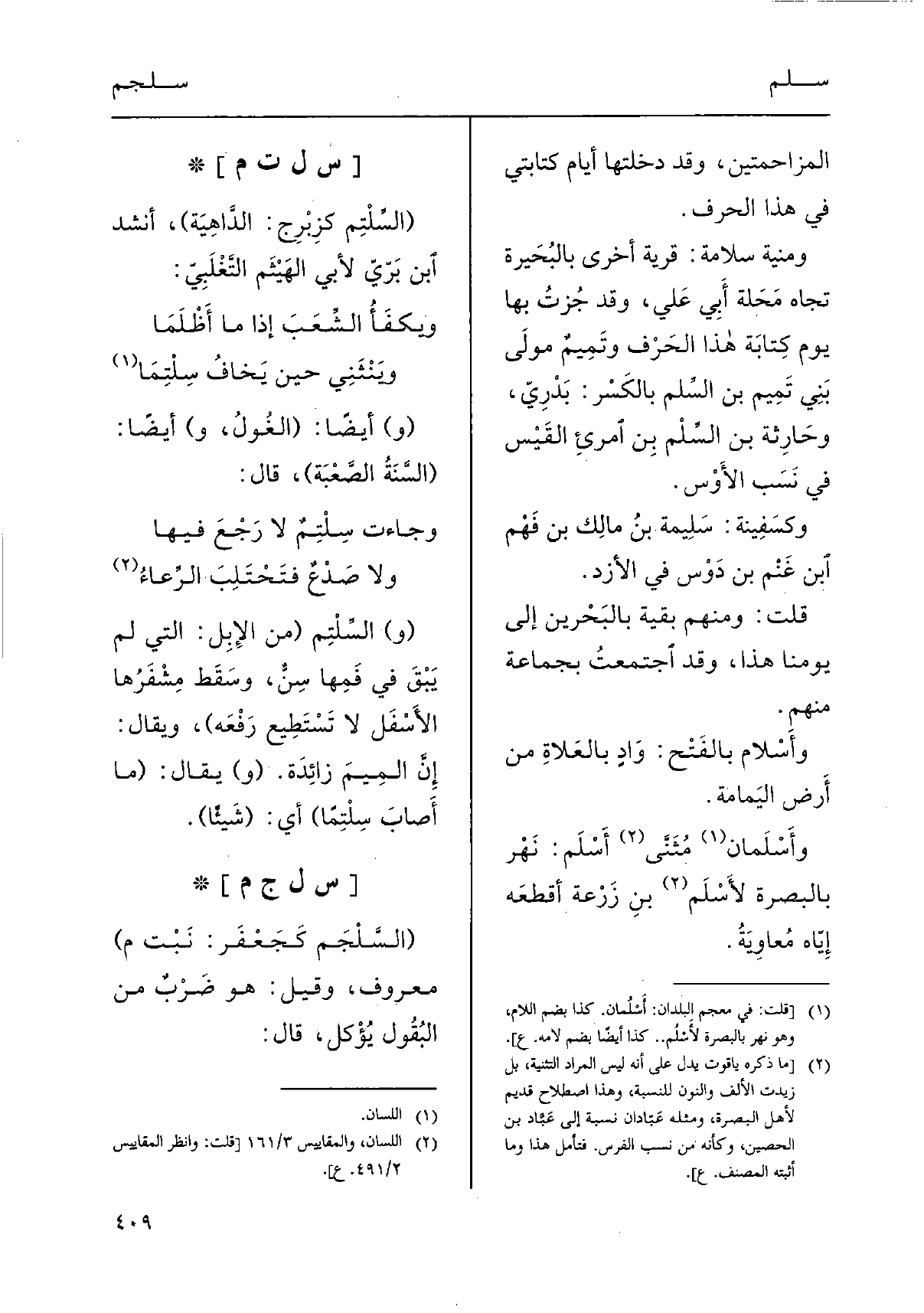 (السَّلْجَم كَجَعْفَر: نَبْت م) مَعْرُوف، وَقيل: هُوَ ضَرْبٌ من البُقُول يُؤْكل، قَالَ: