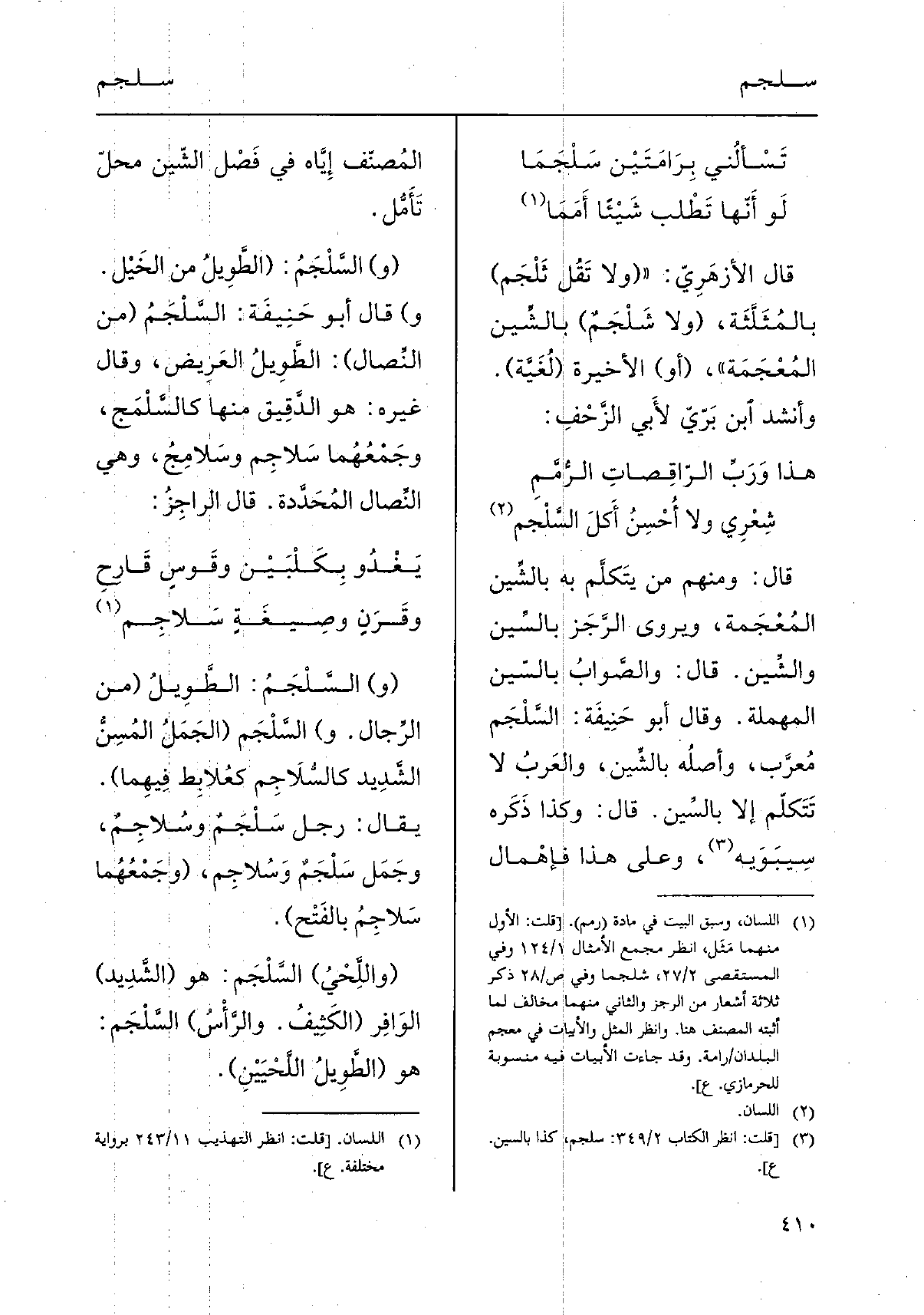 قَالَ: وَمِنْهُم من يتَكلَّم بِهِ بالشِّين المُعْجَمة، ويروى الرَّجَز بالسِّين والشِّين. قَالَ: والصَّوابُ بالسّين الْمُهْملَة. وَقَالَ أَبُو حَنِيفَة: السَّلْجَم مُعرَّب، وأصلُه بالشِّين، والعَربُ لَا تَتَكلّم إِلَّا بالسِّن. قَالَ: وَكَذَا ذَكَره سِيبَوَيه، وعَلى هَذَا فإهْمال المُصنّف إِيَّاه فِي فَصْل الشّين محلّ تَأَمُّل.