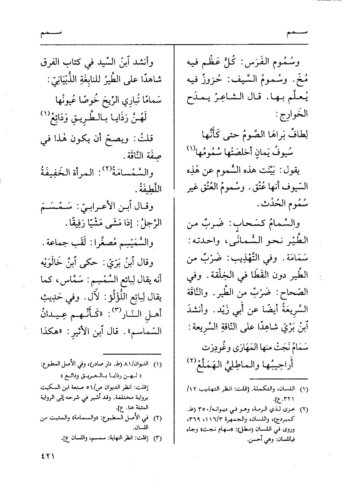 {وسُمُوم الفَرَس: كُلُّ عَظْم فِيهِ مُخّ. وسُمومُ السَّيف: حُروزٌ فِيهِ يُعلَّم بهَا. قَالَ الشاعِرُ يمدَح الخَوارِج: