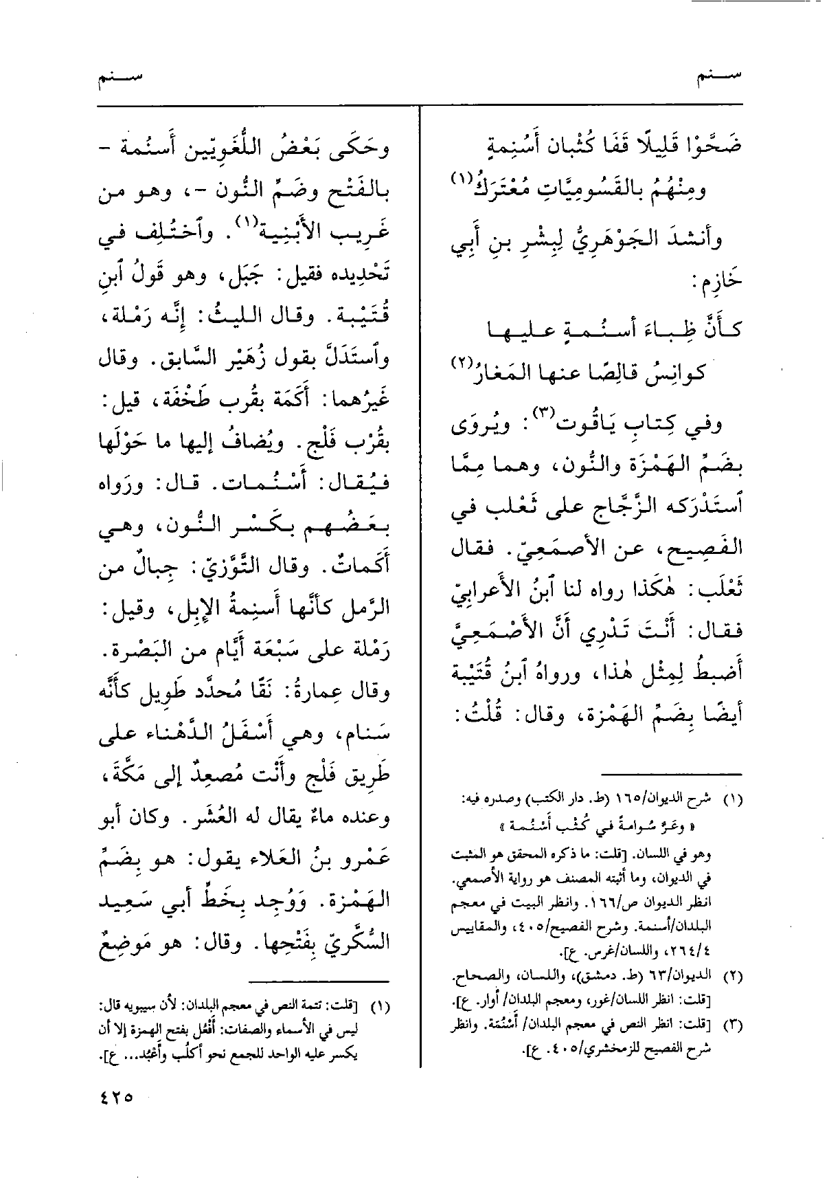 وَفِي كِتاب يَاقُوت: ويُروَى بضَمِّ الهَمْزَة والنُّون، وهما مِمَّا استَدْرَكه الزَّجَّاج على ثَعْلب فِي الفَصِيح، عَن الأصمَعِيّ. فَقَالَ ثَعْلَب: هكَذا رَوَاهُ لنا ابنُ الأَعرابِيّ فَقَالَ: أَنْتَ تَدْرِي أَنَّ الأَصْمَعِيَّ أضبطُ لِمِثْل هَذَا، ورواهُ ابنُ قُتَيْبة أَيْضا بَضَمِّ الهَمْزَة، وَقَالَ: قُلْتُ: وحَكَى بَعْضُ اللُّغَوِيّين أَسنُمة - بالفَتْح وضَمِّ النُّون -، وَهُوَ من غَريب الأَبْنِية. واختُلِف فِي تَحْدِيده فَقيل: جَبَل، وَهُوَ قَوْلُ ابنِ قُتَيْبة. وَقَالَ الليثُ: إِنَّه رَمْلة: واستَدَلَّ بقول زُهَيْر السَّابق. وَقَالَ غَيرُهما: أَكَمَة بقُرب طَخْفَة، قيل: بقُرْب فَلْج. ويُضافُ إِلَيْهَا مَا حَوْلَها فيُقال: أَسْنُمات. قَالَ: ورَواه بعَضُهم بكَسْر النُّون، وَهِي أَكَماتٌ. وَقَالَ التَّوَّزيّ: جِبالٌ من الرَّمل كأنَّها أَسنِمةُ الإِبِل، وَقيل رَمْلة على سَبْعَة أَيَّام من البَصْرة. وَقَالَ عِمارةُ: نَقًا مُحدَّد طَوِيل كأَنَّه سَنام، وَهِي أَسْفَلُ الدَّهْناء على طَرِيق فَلْج وأَنْت مُصعِدٌ إِلَى مَكَّةَ، وَعِنْده ماءٌ يُقَال لَهُ العُشَر. وَكَانَ أَبُو عَمْرو بنُ العَلاء يَقُول: هُوَ بِضَمِّ الهَمْزة. وَوُجِد بِخَطِّ أبي سَعِيد السُّكَّريّ بِفَتْحِها. وَقَالَ: هُوَ مَوضِعٌ