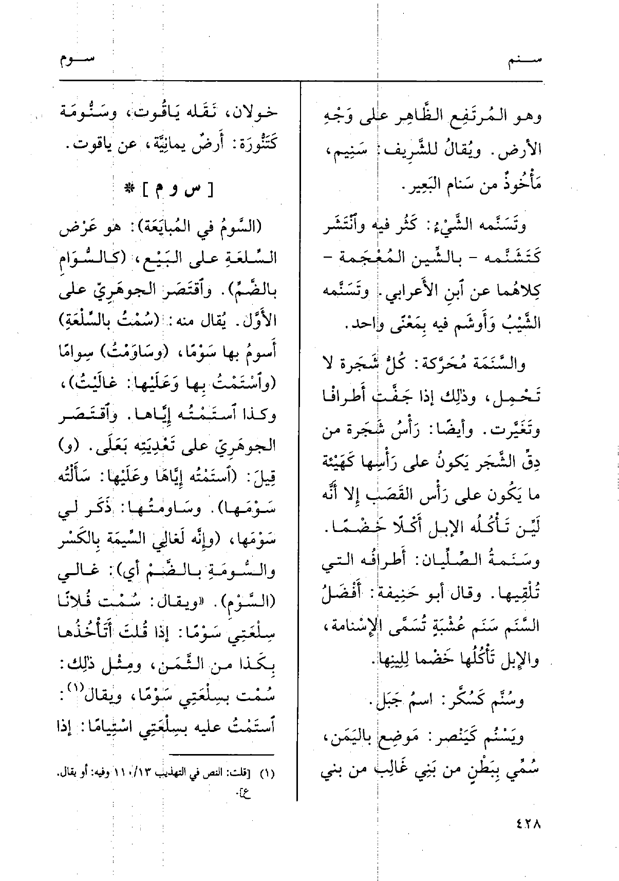( {السَّومُ فِي المُبايَعَة) : هُوَ عَرْض السِّلعَةِ على البَيْع، (} كالسُّوَامِ بالضَّمِّ) . واقتَصَر الجوهَرِيُّ على الأَوَّل. يُقال مِنْهُ: ( {سُمْتُ بالسِّلْعَةِ) } أَسومُ بهَا {سَوْمًا، (} وسَاوَمْتُ) {سِوامًا (} واسْتَمْتُ بِها وَعَلَيْها: غالَيْتُ) ، وَكَذَا {اسْتَمْتُه إِيَّاها. واقتَصَر الجوهَرِيّ على تَعْدِيَتِه بَعَلَى. (و) قِيلَ: (} استَمْتُه إِيَّاها وعَلَيْها: سَأَلْتُه {سَوْمَها) . وسَاومتُها: ذَكَر لي سَوْمَها، (وإِنَّه لَغالِي} السِّيمَة بِالكَسْر {والسُّومَةِ بالضَّمْ أَي) : غالي (السَّوْمِ) . " وَيُقَال: سُمْت فُلانًا سِلْعَتِي سَوْمًا: إِذا قُلتَ أَتَأْخُذُها بِكَذا من الثَّمَن، ومِثْل ذلِك: سُمْت بسِلْعَتِي سَوْمًا، وَيُقَال: استَمْتُ عَلَيْهِ بسِلْعَتِي} استِيامًا: إِذا