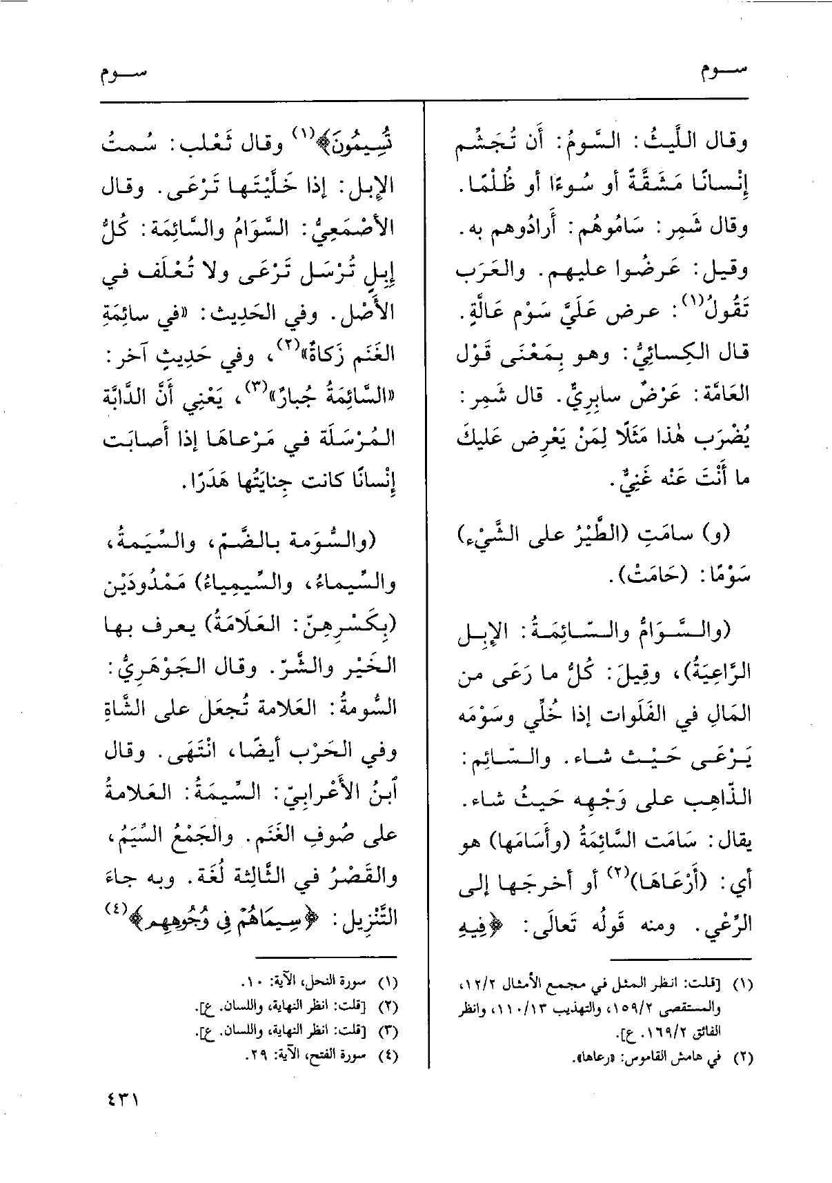 وَقَالَ اللَّيثُ: السَّومُ: أَن تُجَشِّم إِنْساناً مَشَقَّةً أَو سُوءاً أَو ظُلْماً. وَقَالَ شَمِر: {سَامُوهُم: أَرادُوهم بِهِ. وَقيل: عَرضُوا عَلَيْهِم. والعَرَب تَقُولُ: عرض عَلَيَّ} سَوْم عَالَّةٍ. قَالَ الكِسائِيُّ: وَهُوَ بِمَعْنى قَوْل العَامَّة: عَرْضٌ سابِرِيٌّ. قَالَ شَمِر: يُضْرَب هَذَا مَثَلاً لِمَنْ يَعْرِض عَليكَ مَا أَنْتَ عَنْه غَنِيٌّ.