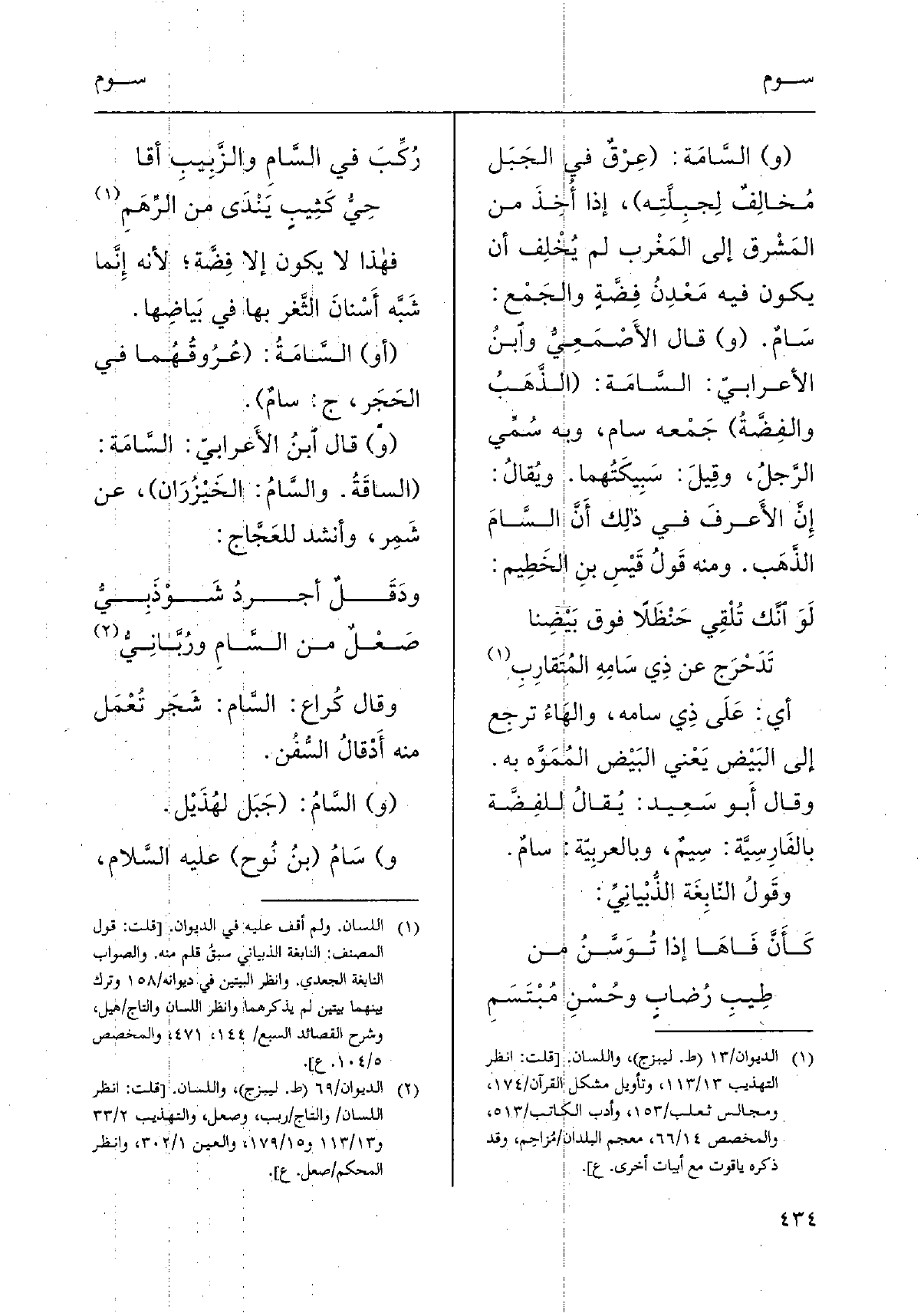 أَي: عَلَى ذِي سامه، والهَاءُ ترجِع " إِلَى البَيْض يَعْني البَيْض المُمَوَّه بِهِ. وَقَالَ أَبو سَعِيد: يُقالُ للفِضَّة بالفَارِسيَة: {سِيمٌ، وبالعربِيّة: سامٌ. وقَولُ النّابِغَة الذُّبْيانِيِّ: