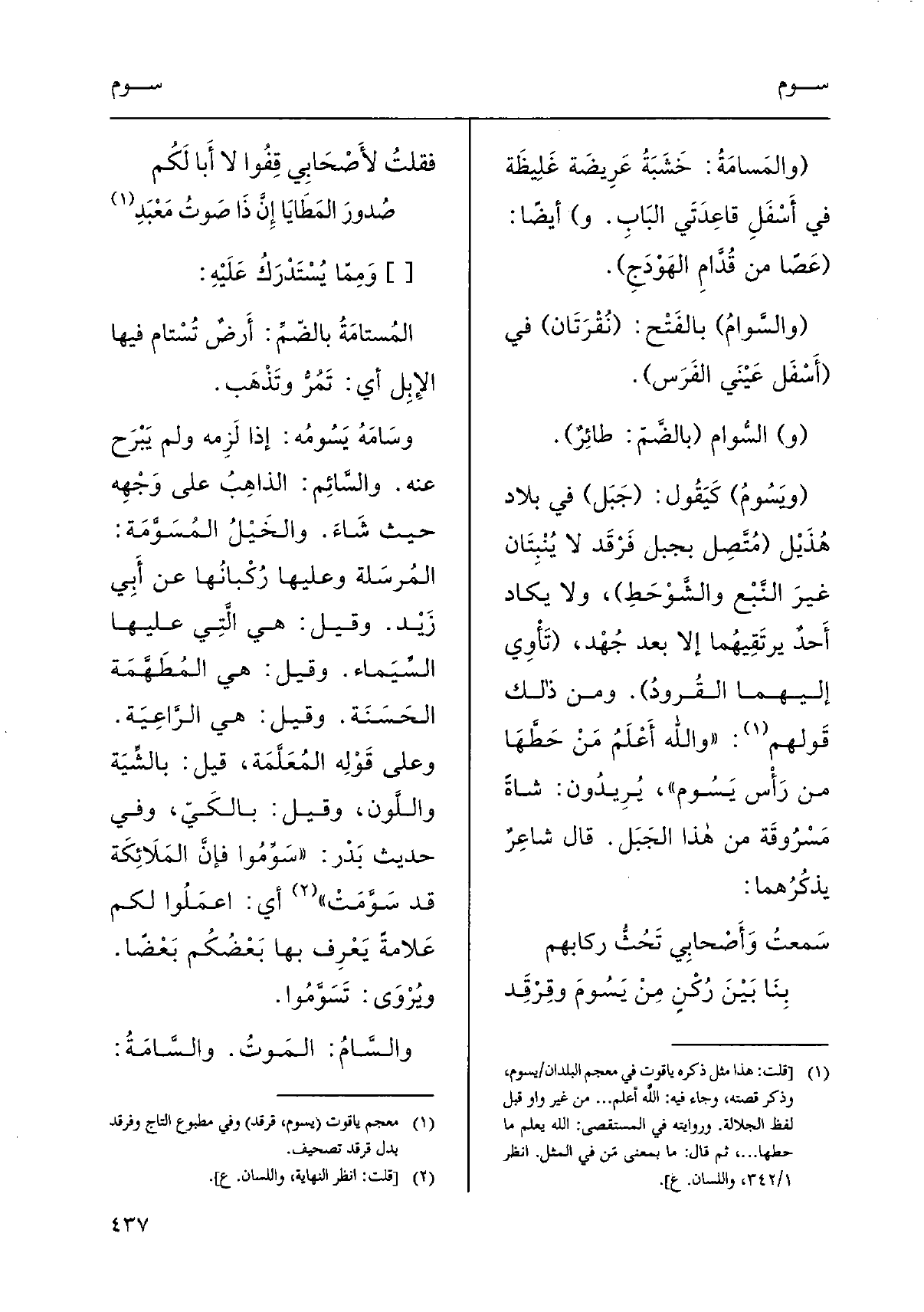} وسَامَهُ {يَسُومُه: إِذا لَزِمه وَلم يَبْرَح عَنهُ.} والسَّائِم: الذاهِبُ على وجْهِه حَيْثُ شَاءَ. والخَيْلُ {المُسَوَّمَة: المُرسَلة وَعَلَيْهَا رُكْبانُها عَن أَبِي زَيْد. وَقيل: هِيَ الَّتِي عَلَيْهَا} السَّيَماء. وَقيل: هِيَ المُطَهَّمَة الحَسَنَة. وَقيل: هِيَ الرَّاعِيَة. وعَلى قَوْلِه المُعَلَّمَة، قيل: بالشِّيَة واللَّون، وَقيل: بالكَيّ، وَفِي حَدِيث بَدْر: " {سَوِّمُوا فإنَّ المَلاَئِكَة قد} سَوَّمَتْ " أَي: اعمَلُوا لكم عَلامةً يَعْرِف بهَا بَعْضُكُم بَعْضًا. ويُرْوَى: {تَسَوَّمُوا.