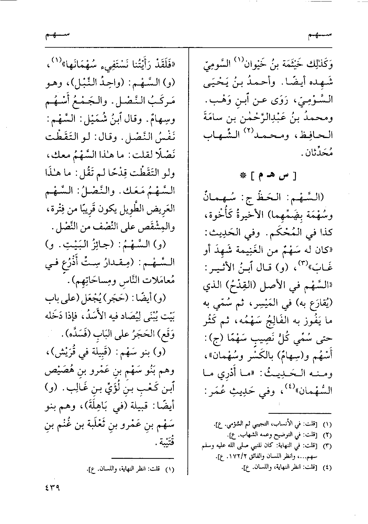 (السَّهْم: الحَظّ ج: سُهمانٌ وسُهْمة بِضَمِّهِما) الأخيرةُ كَأُخْوة، كَذَا فِي المُحْكَم. وَفِي الحَدِيث: " كَانَ لَهُ سَهْمٌ من الغَنِيمة شَهِد أَو غَابَ "، (و) قَالَ ابنُ الْأَثِير: " السَّهْم فِي الأَصْل (القِدْحُ) الَّذِي (يُقارَع بِهِ) فِي المَيْسِر، ثمَّ سُمّي بِهِ مَا يَفُوز بِهِ الفَالِجُ سَهْمُه، ثمَّ كَثُر حَتَّى سُمِّي كُلُّ نَصِيبٍ سَهْمًا (ج) : أَسْهُم و (سِهامٌ) بالكَسْر وسُهْمان "، وَمِنْه الحَدِيثُ: " مَا أَدْرِي مَا السُّهْمان "، وَفِي حَدِيثِ عُمَر: " فَلَقَدْ رَأَيْتُنا نَسْتَفِيء سُهْمَانَها "،