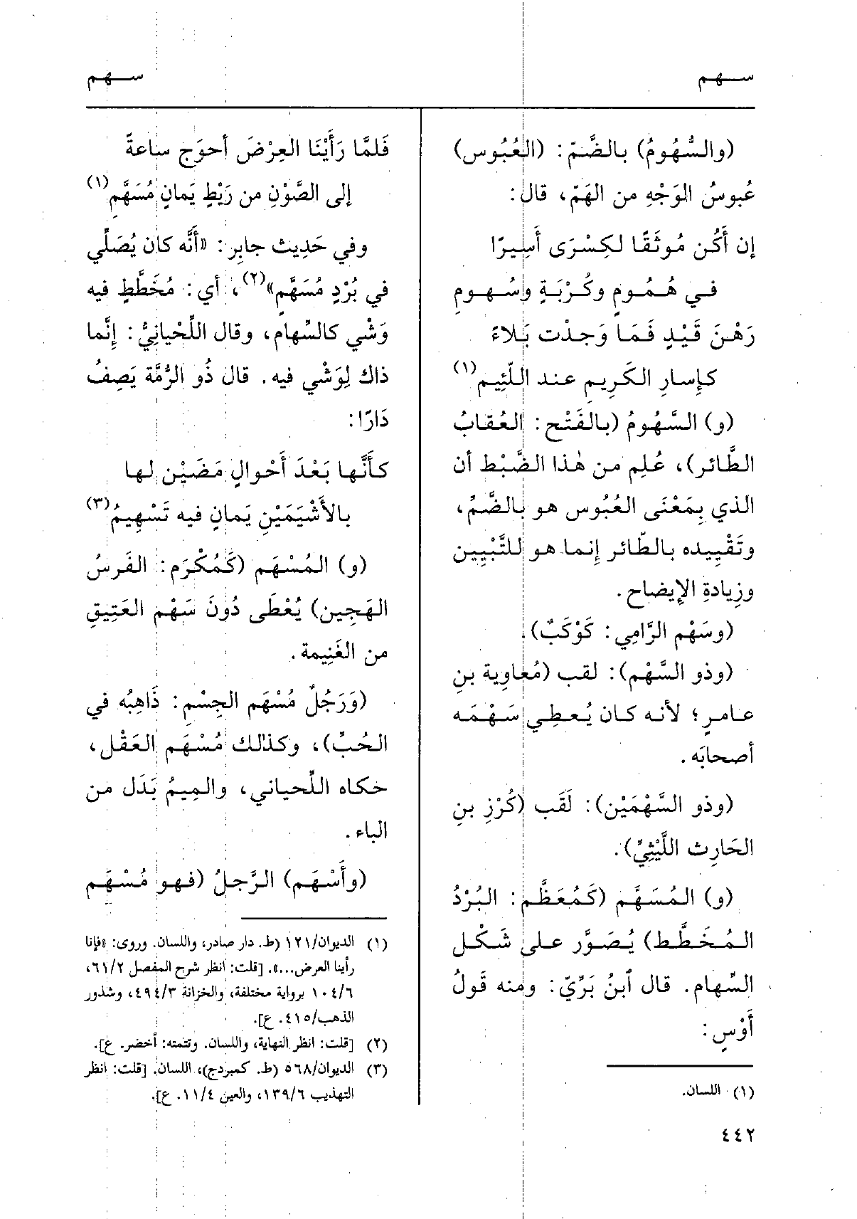 (و) المُسَهَّم (كَمُعَظَّم: البُرْدُ المُخَطَّط) يُصَوَّر على شَكْل السَّهام. قَالَ ابنُ بَرِّيّ: وَمِنْه قَولُ أُوْسٍ: