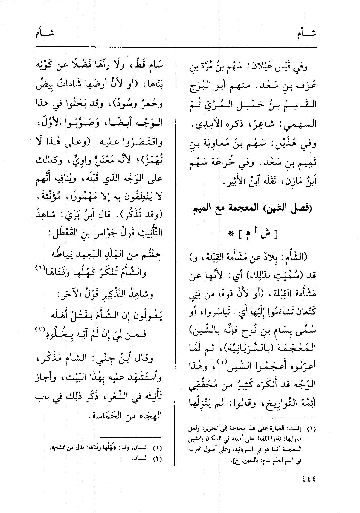( {الشَّأْم: بِلادٌ عَن} مَشْأَمة القِبْلة، و) قد (سُمِّيَتِ لذلِك) أَي: لأَنَّها عَن مَشْأَمة القِبْلة، (أَو لأَنَّ قوما من بَنِي كَنْعان {تَشاءَمُوا إِلَيْها أَي: تَياسَروا، أَو سُمِّي بِسامِ بنِ نُوح فإِنَّه بالشِّين) المُعْجَمَة (بالسُّرْيَانِيَّة) ، ثمَّ لَمَّا أعرَبُوه أَعجَمُوا الشِّين، وَهَذَا الوَجْه قد أَنْكَرَه كَثِيرٌ من مُحَقِّقِي أَئِمَّة التَّوارِيخ، وَقَالُوا: لم يَنْزِلْها سَام قَطّ، ولاَ رآهَا فَضْلاً عَن كَوْنِه بَنَاهَا، (أَو لأنَّ أرضَها} شَاماتٌ بِيضٌ وحُمرٌ وسُودٌ) ، وَقد بَحَثُوا فِي هَذَا الوَجْه أَيْضا، وَصَوَّبُوا الأَوَّلَ واقتَصَرُوا عَلَيْهِ. (وعَلى هَذَا لاَ تُهْمَزُ) ؛ لأنَّه مُعْتَلٌّ واوِيٌّ، وَكَذَلِكَ على الوَجْه الَّذِي قَبْلَه، ويُنافِيه أَنَّهم لَا يَنْطِقُون بِهِ إِلَّا مَهْمُوزًا، مُؤَنَّثةَ، (وَقد تُذَكَّر) . قَالَ ابنُ بَرِّيّ: شاهِدُ التَّأْنِيثِ قَولُ جَوَّاس بنِ القَعْطَل: