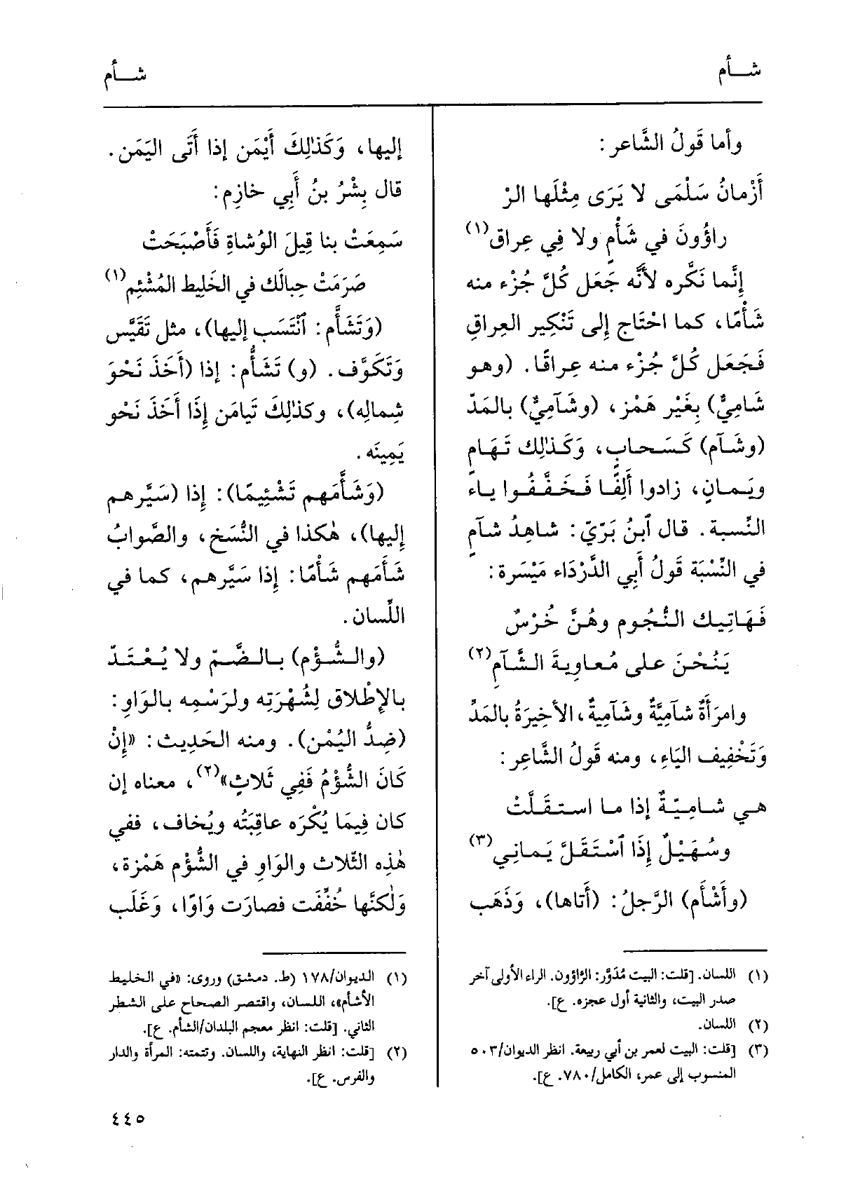 إِنَّما نَكِّره لأنَّه جَعَل كُلَّ جُزْء مِنْهُ {شَأْمًا، كَمَا احْتَاج إِلى تَنْكِير العِراقِ فَجَعَل كُلَّ جُزْء مِنْهُ عِراقًا. (وَهُوَ} شَامِيٌّ) بِغَيْر هَمْز، ( {وشَآمِيٌّ) بالمَدّ (} وشَآم) كَسَحابٍ، وَكَذلِك تَهَامٍ ويَمانٍ، زادوا أَلِفًا فَخَفَّفُوا يَاء النِّسبة. قَالَ ابنُ بَرّيّ: شاهِدُ {شآمٍ فِي النِّسْبَة قَولُ أَبِي الدَّرْدَاء مَيْسَرة: