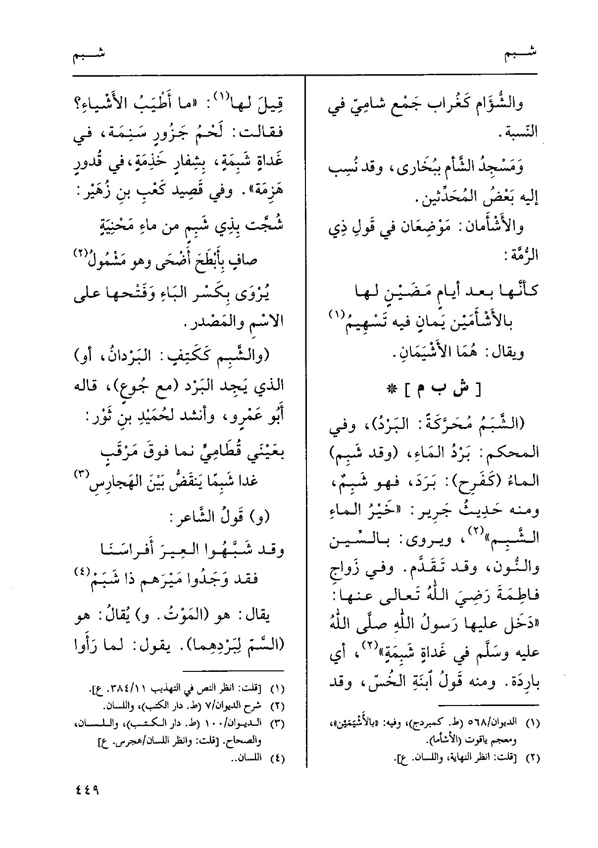 ] فِي غَداةٍ شَبِمَةٍ "، أَي بارَدَة. وَمِنْه قَولُ ابنَةِ الخُسّ، وَقد قِيلَ لَهَا: " مَا أَطْيَبُ الأَشْياءِ؟ فَقَالَت: لَحْمً جَزُورٍ سَنِمَة، فِي غَداةٍ شَبِمَةٍ، بِشِفارٍ خَذَمَةٍ، فِي قُدورٍ هَزَمَة ". وَفِي قَصَيد كَعْبِ بنِ زُهَيْر: