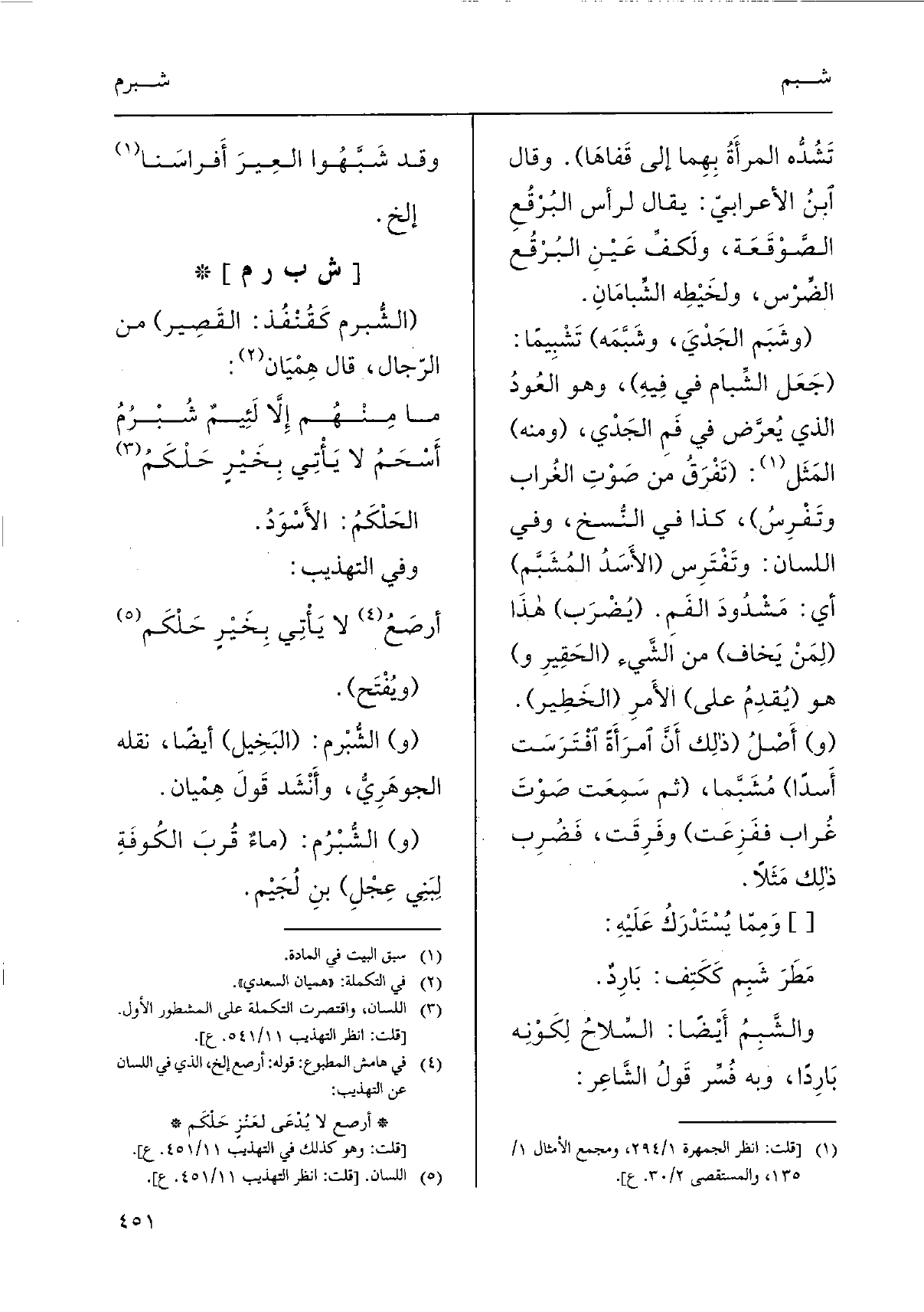 (مَا مِنْهُم إِلاَّ لَئِيمٌ شُبْرُمُ ... أَسْحَمُ لَا يَأْتِي بِخَيْرٍ حَلْكَمُ)