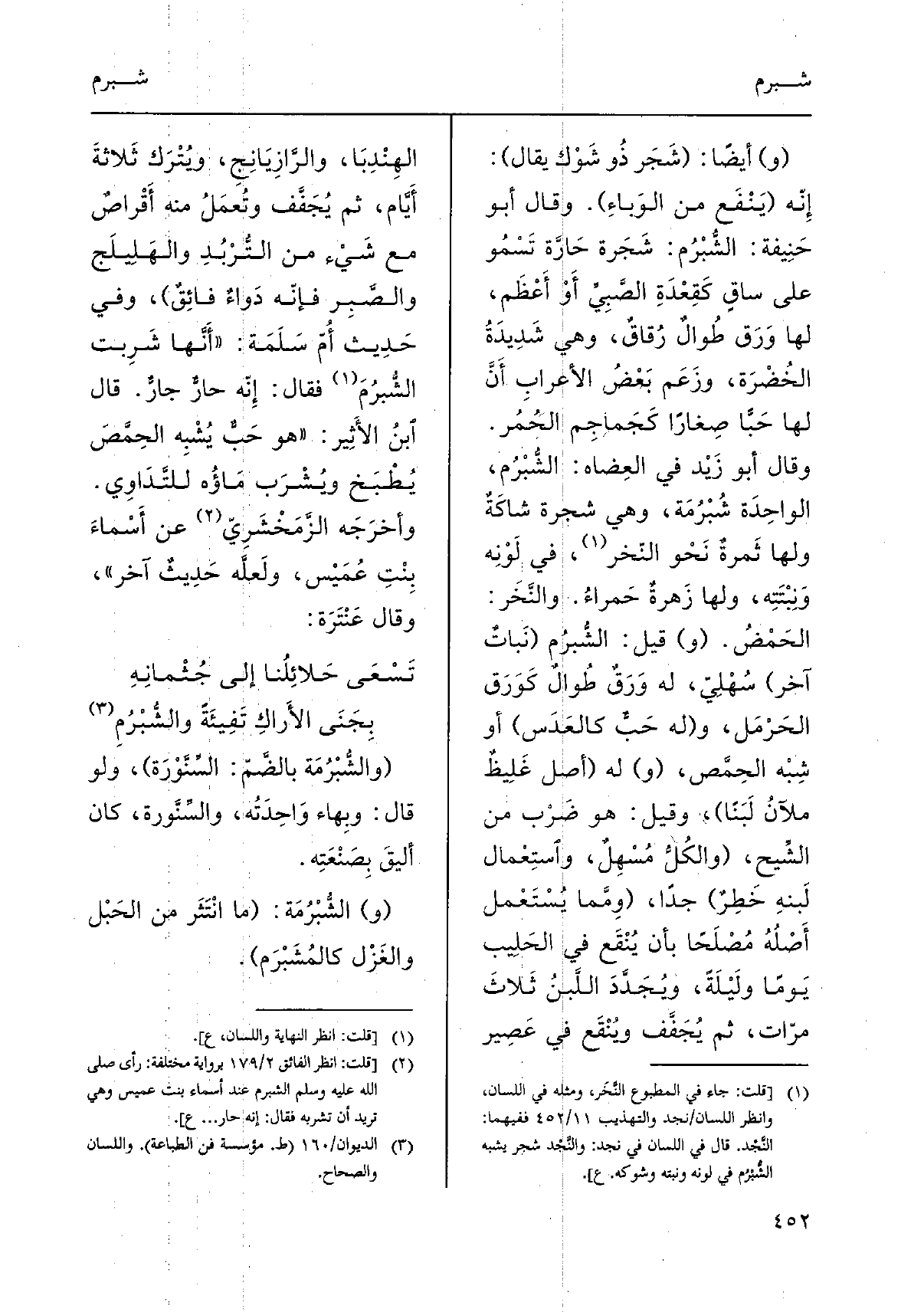 (و) أَيْضا: (شَجَر ذُو شَوْك يُقَال) : إِنّه (يَنْفَع من الوَباءِ) . وَقَالَ أَبُو حَنِيفة: الشُّبْرُم: شَجَرة حَارَّة تَسْمُو على ساقٍ كَقِعْدَةِ الصَّبِيِّ أَوْ أعْظَم، لَهَا وَرَق طُوالٌ رُقاقٌ، وَهِي شَدِيدَةُ الخُضْرَة، وزَعَم بَعْضُ الأعرابِ أَنَّ لَهَا حَبًّا صِغارًا كَجَماجم الحُمُر. وَقَالَ أَبُو زَيْد فِي العِضاه: الشُّبْرُم، الواحِدَة شُبْرُمَة، وَهِي شَجَرَة شاكَةٌ وَلها ثَمرةٌ نَحْو النّخر، فِي لَوْنِه وَنِبْتَتِه، وَلها زَهرةٌ حَمراءُ. والنَّخَر: الحَمْضُ. (و) قيل: الشُّبرُم (نَباتٌ آخر) سُهْلِيّ، لَهُ وَرَقٌ طُوالٌ كَوَرَق الحَرْمَل، و (لَهُ حَبٌّ كالعَدَس) أَو شبْه الحِمَّص، (و) لَهُ (أصل غَلِيظٌ ملآنُ لَبَنًا) ، وَقيل: هُوَ ضَرْب من الشِّيح، (والكُلُّ مُسْهِلٌ، واستِعْمال لَبنهِ خَطِرٌ) جدا، (ومِمَّا يُسْتَعْمل أَصْلُه] مُصْلَحًا بِأَن يُنْقَع فِي الحَلِيب يَومًا ولَيْلَةً، ويُجَدَّدَ اللَّبنُ ثَلاثَ مرّات، ثمَّ يُجَفَّف ويُنْقَع فِي عَصِير الهِنْدِبَا، والرَّازِيَانِجِ، ويُتْرَك ثَلاثةَ أَيَّام، ثمَّ يُجَفَّف وتُعمَلُ مِنْهُ أَقْراصٌ مَعَ شَيْء من التُّرْبُدِ والهَليلَج والصَّبِر فإنّه دَواءٌ فائِقٌ) ، وَفِي حَدِيث أُمّ سَلَمَة: " أَنَّها شَرِبت الشُبرُمَ فَقَالَ: إِنّه حارٌّ جارٌّ. قَالَ ابنُ الأَثِير: " هُوَ حَبُّ يُشْبِه الحِمَّصَ يُطْبَخ ويُشْرَب مَاؤُه للتَّدَاوِي. وأخرَجَه الزَّمَخْشَرِيّ عَن أَسْماءَ بنْتِ عُمَيْس، ولَعلَه حَدِيثٌ آخر "، وَقَالَ عَنْتَرَة: