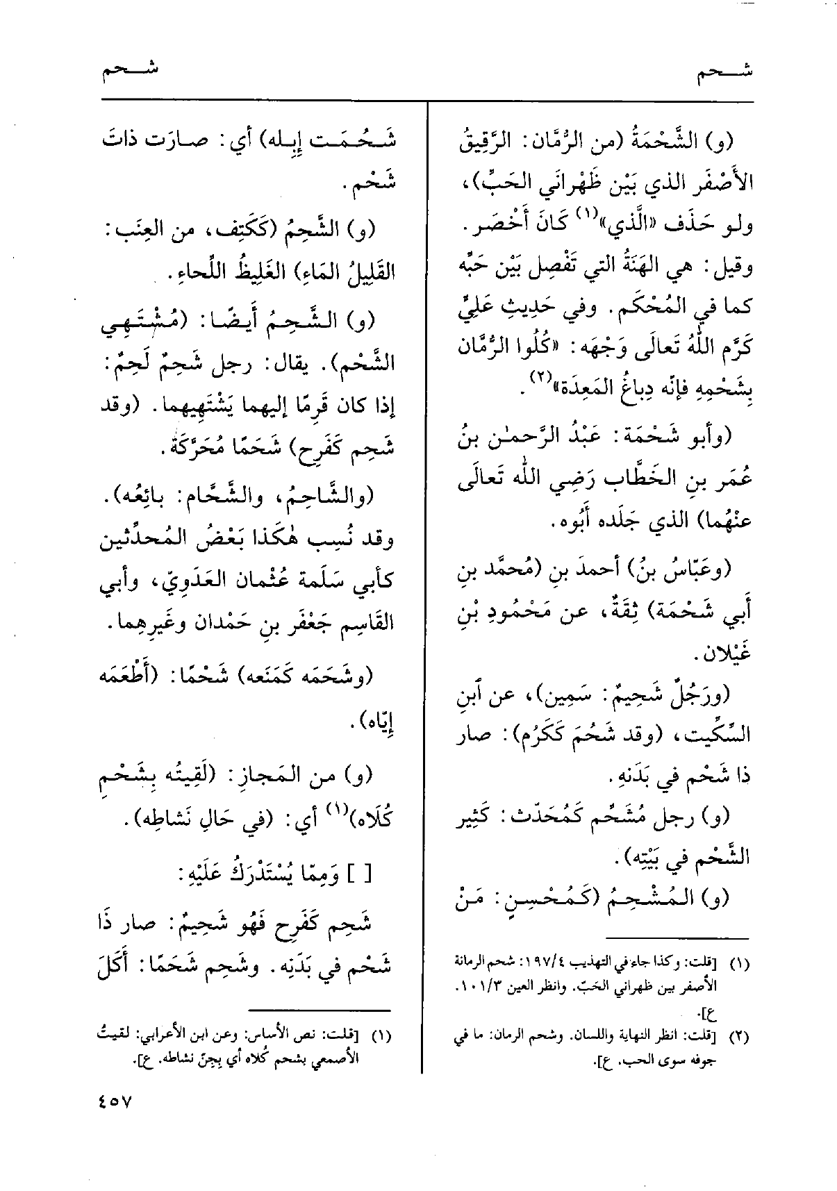 (و) الشَّحْمَةُ (من الرُّمَّان: الرَّقِيقُ الأَصْفَر الَّذِي بَيْن ظَهْرانَي الحَبِّ) ، وَلَو حَذَف " الَّذي " كَانَ أَخْضَر. وَقيل: هِيَ الهَنَةُ الَّتِي تَفْصِل بَيْن حَبِّه كَمَا فِي المُحْكَم. وَفِي حَدِيثِ عَلِيٍّ كَرَّم اللهُ تَعالَى وَجْهَه: " كُلُوا الرُّمَّان بِشِحْمِهِ فإنّه دِباغُ المَعِدَة ".