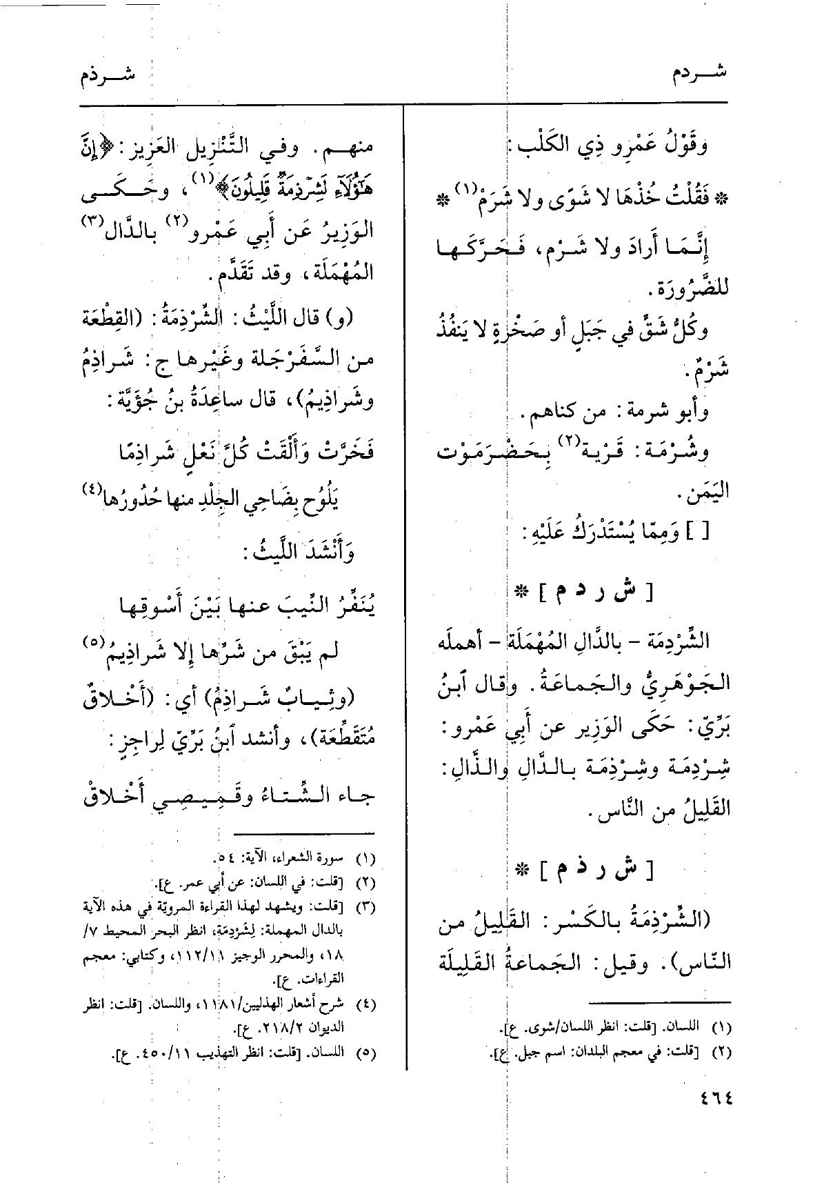 (و) قَالَ اللَّيْثُ: الشِّرْذِمَةُ: (القِطْعَة من السَّفْرْجَلة وغَيْرها ج: شَراذِمُ وشَراذِيمُ) ، قَالَ ساعِدَةُ بنُ جُؤَيَّة