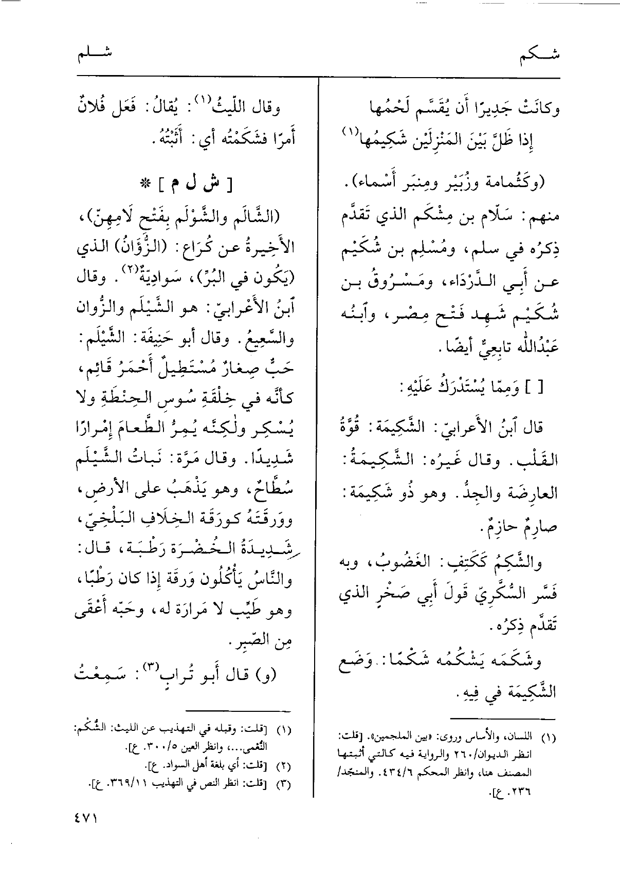 (الشَّالَم والشَّوْلَم بِفَتْح لاَمِهِنّ) ، الأَخِيرةُ عَن كُرَاع: (الزُؤَانُ) الَّذِي (يَكُون فِي البُرِّ) ، سَوادِيّةُ. وَقَالَ ابنُ الأَعْرابيّ: هُوَ الشَّيْلَم والزُّوان والسَّعِيعُ. وَقَالَ أَبُو حَنِيفَة: الشَّيْلَم: حَبٌّ صِغارٌ مُسْتَطِيلٌ أَحْمَرُ قَائِم، كأنَّه فِي خِلْقَةِ سُوسِ الحِنْطَةِ وَلَا يُسْكِر ولكِنَّه يُمِرُّ الطَّعامَ إمْرارًا شَدِيداً. وَقَالَ مَرَّة: نَباتُ الشَّيْلَم سُطّاحٌ، وَهُوَ يَذْهَبُ على الأرضِ، ووَرقَتَهُ كورَقَة الخِلاَفِ البَلْخِيّ، شَديدَةُ الخُضْرَة رَطْبَة، قَالَ: والنَّاسُ يَأْكُلُون وَرَقة إِذا كَانَ رَطْبًا، وَهُوَ طَيِّب لَا مَرارَة لَهُ، وحَبّه أَعْقَى مِن الصّبِر.